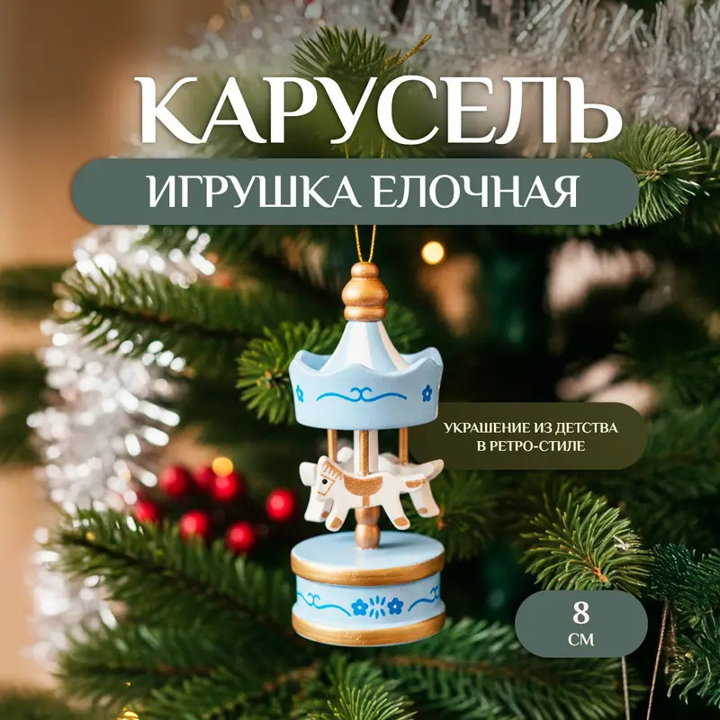 Ёлочная игрушка «Карусель» выполнена в уютном ретро-стиле и привносит в интерьер атмосферу тёплого, доброго новогоднего детства. Аккуратная миниатюра высотой 8 см изготовлена из дерева, полиэстера и полирезина, благодаря чему выглядит выразительно и остаётся прочной при использовании. Такая игрушка станет красивым акцентом на праздничной ёлке и добавит ей особого шарма и ностальгии.