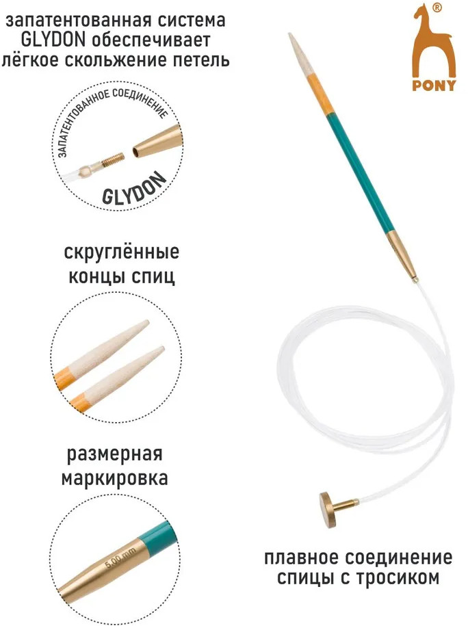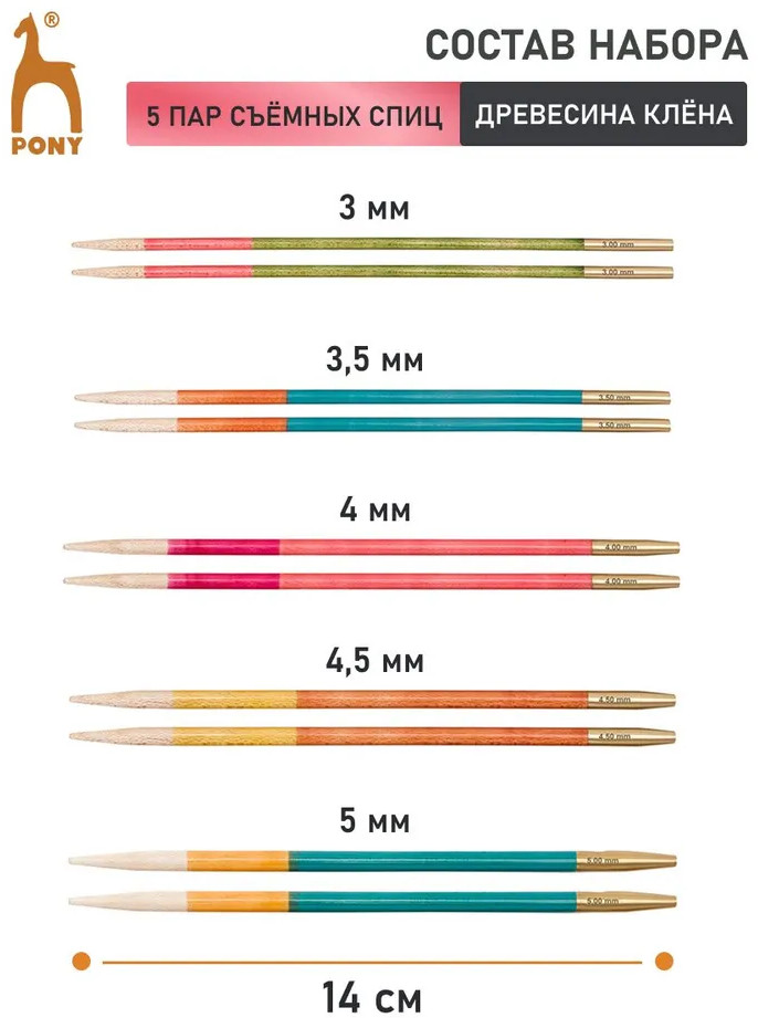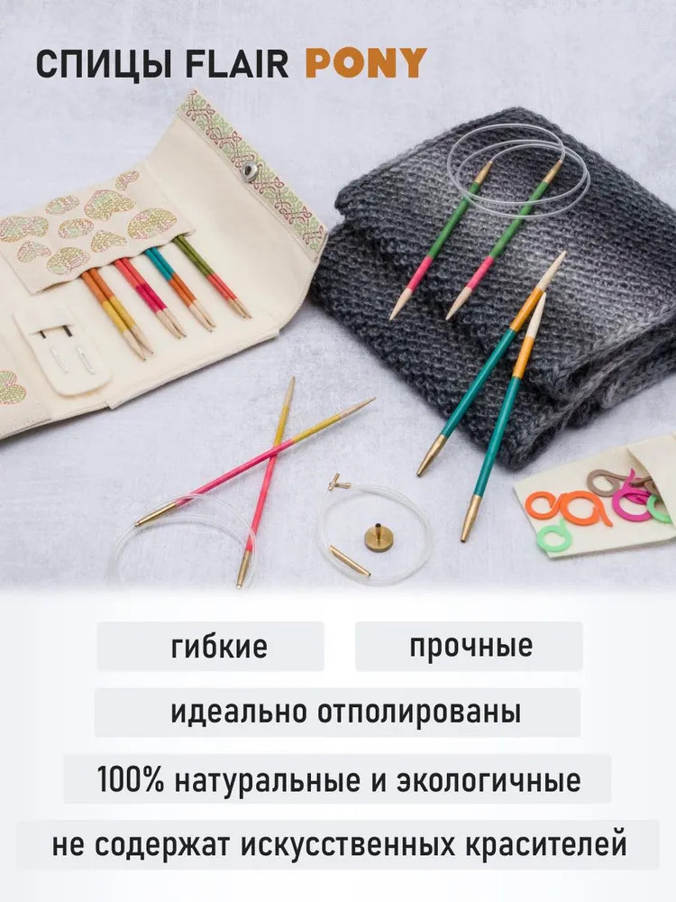 Спицы для вязания Pony со сменными гибкими тросиками подходят для работы в круговой и прямой техниках. На них можно вязать самые разные вещи, например, свитеры и манишки. Спицы удобны для создания широкого полотна, например, пледов или ковриков, и подходят для любого типа пряжи. Спицы для вязания круговые произведены из упругой и плотной древесины клена, прочные и почти не стучат при вязании. Подходят для путешественников. Многие авиакомпании разрешают брать деревянные спицы в салон лайнера вместе с ручной кладью. Экологичные, так как клен не содержит вредных веществ и добывается в возобновляемых лесах. Спицы покрыты природными красителями и лаком натурального происхождения. Спицы для вязания тщательно отполированы, с приятной шелковистой текстурой. Берегут фактуру пряжи и руки вязальщицы.