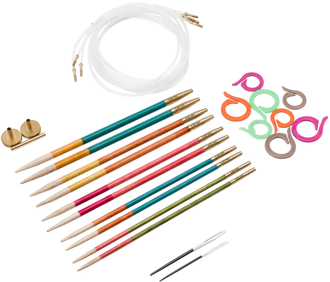 В наборе 21 предмет: спицы диаметром 3 мм, 3.5 мм, 4 мм, 4.5 мм, 5 мм. (10 шт.), булавки для маркировки петель (8 шт.), сменные гибкие тросики, пластиковые иглы для шерсти (2 шт.); заглушки для спиц (2 шт.), коннектор для тросика (1 шт.). |