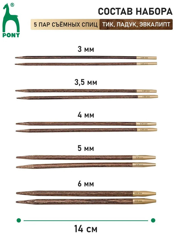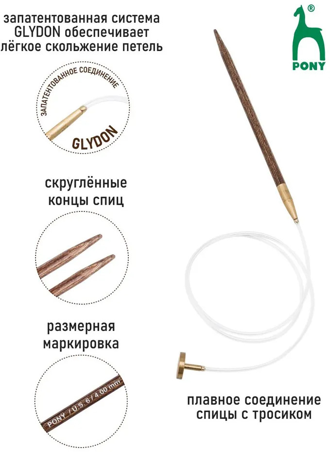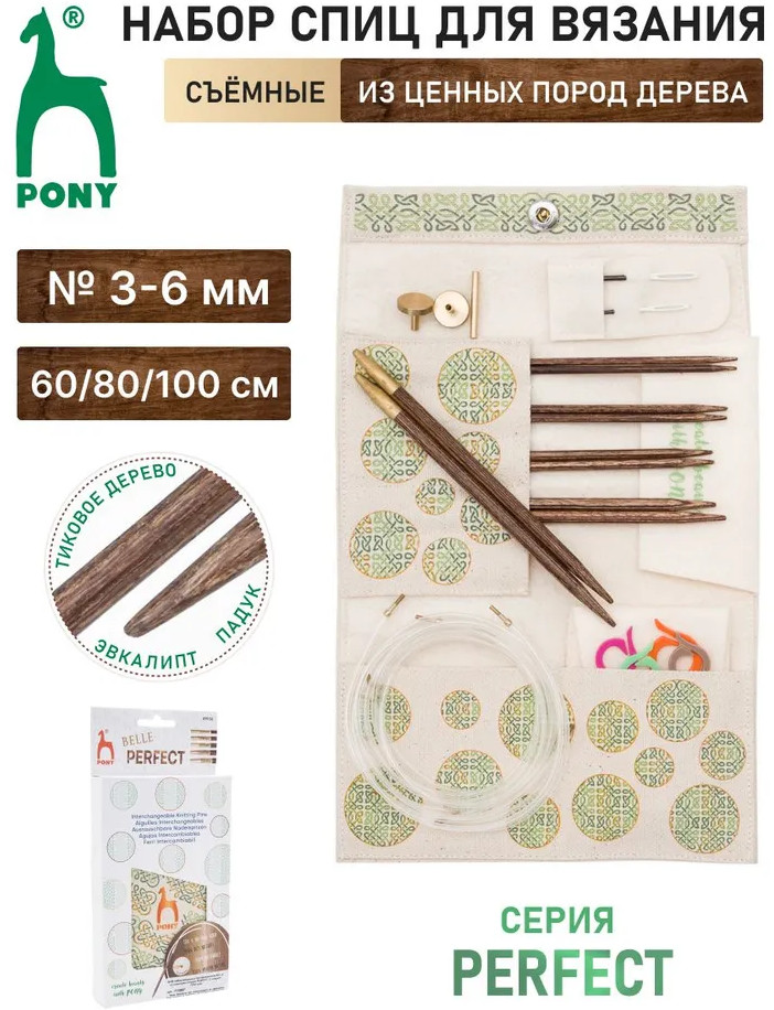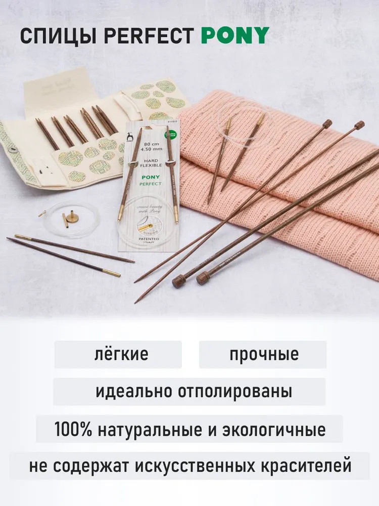 Спицы Pony Perfect предназначены для работы в круговой или прямой техниках. Используются для вязания свитеров, манишек, шапок, снудов и других вещей. Удобны для создания широкого полотна, например, пледов или ковриков. Подходят для любой пряжи, в том числе вискозы или мерсеризованного хлопка. Спицы для вязания изготовлены из трех пород ценной древесины: эвкаплипта, падука и тика. Сырье добывают в возобновляемых лесах, чтобы не вредить окружающей среде. Произведены по той же технологии, что и бильярдные кии: слои древесины спрессовывают, а затем шлифуют и полируют. Спицы круговые прочные и гибкие, не скалываются и не ломаются во время вязания. Теплые и приятные на ощупь. Гладко отшлифованы, берегут фактуру пряжи, а также руки вязальщицы. Спицы для вязания круговые подходят для путешественников. Многие авиакомпании разрешают брать деревянные спицы в салон лайнера вместе с ручной кладью. При производстве не используются искусственные красители или пигменты.