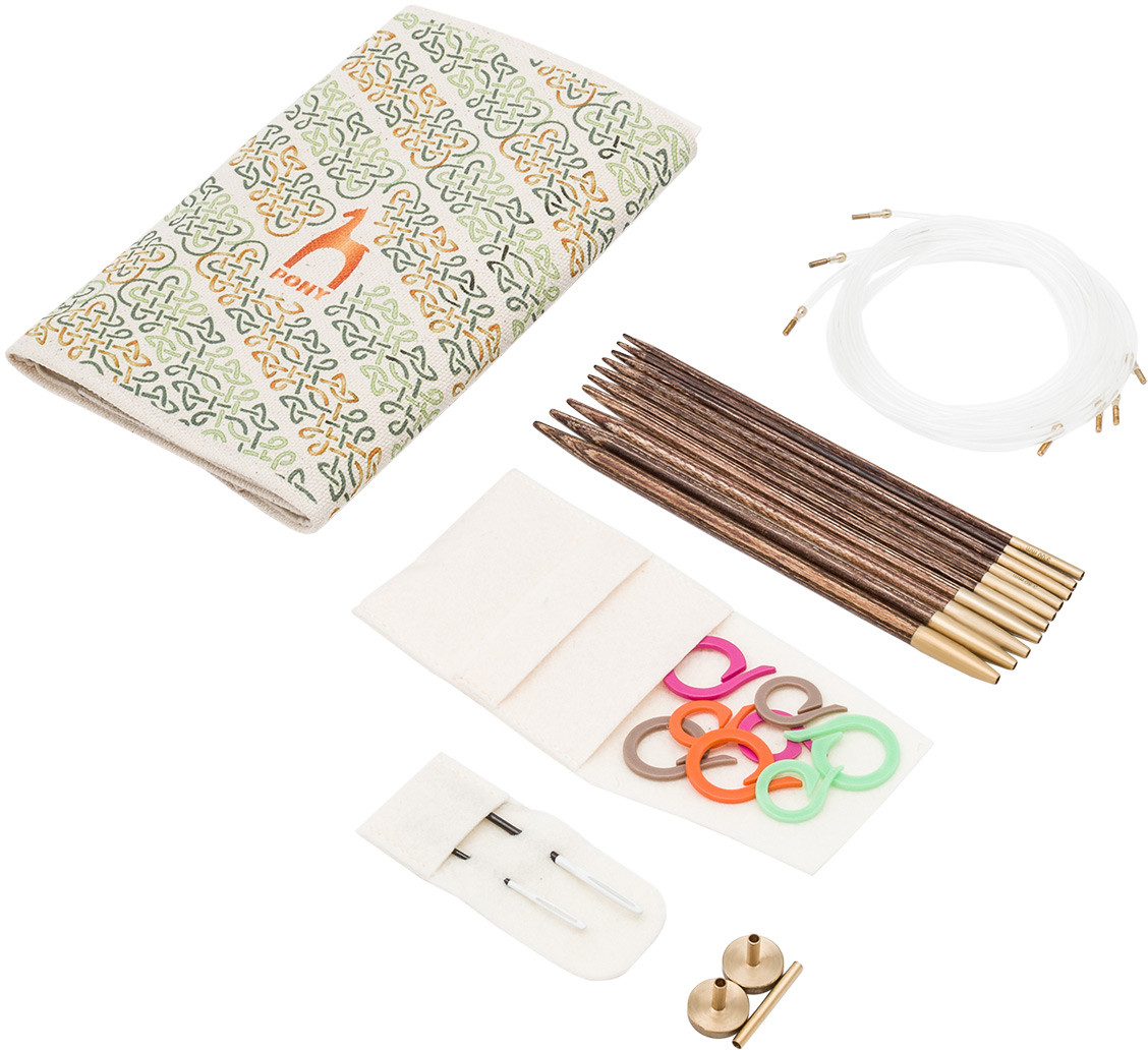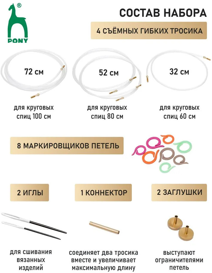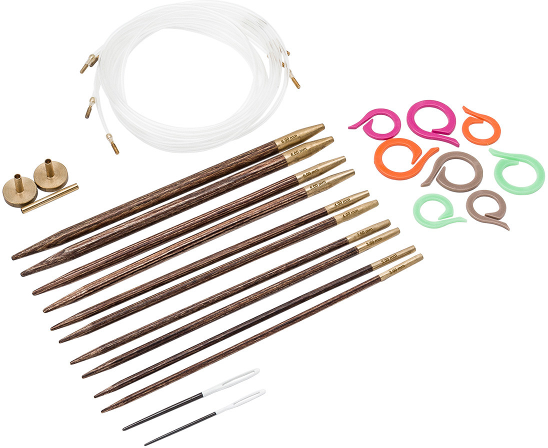 В наборе 21 предмет: спицы диаметром 3мм, 3.5 мм, 4 мм, 5 мм, 6 мм. (10 шт.), булавки для маркировки петель (8 шт.), сменные гибкие тросики, пластиковые иглы для шерсти (2 шт.); заглушки для спиц (2 шт.), коннектор для тросика (1 шт.). |