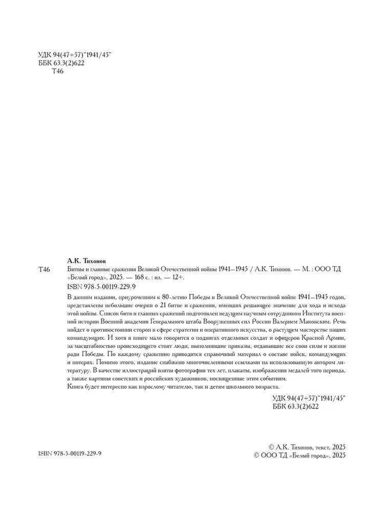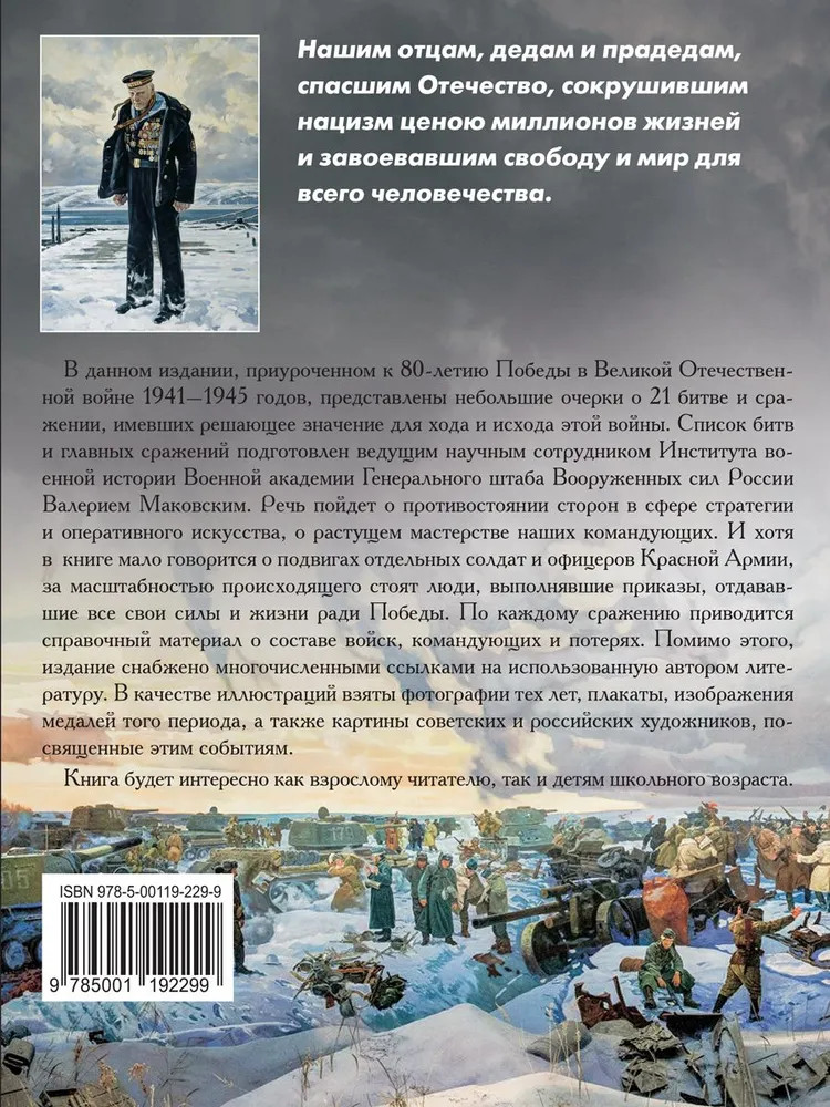 💳 Оплатить за товар можно при получении 🇰🇿 Есть бесплатная доставка по Казахстану 🎁 Копите бонусы с каждой покупки Серия: Юбилейные даты В данном издании, приуроченном к 80-летию Победы в Великой Отечественной войне 1941-1945 годов, представлены небольшие очерки о 21 битве и сражении, имевших решающее значение для хода и исхода этой войны. Список битв и главных сражений подготовлен ведущим научным сотрудником Института военной истории Военной академии Генерального штаба Вооруженных сил России Валерием Маковским. Речь пойдет о противостоянии сторон в сфере стратегии и оперативного искусства, о растущем мастерстве наших командующих. И хотя в книге мало говорится о подвигах отдельных солдат и офицеров Красной Армии, за масштабностью происходящего стоят люди, выполнявшие приказы, отдававшие все свои силы и жизни ради Победы. По каждому сражению приводится справочный материал о составе войск, командующих и потерях. Помимо этого, издание снабжено многочисленными ссылками на использованную автором литературу. В качестве иллюстраций взяты фотографии тех лет, плакаты, изображения медалей того периода, а также картины советских и российских художников, посвященные этим событиям (в книге 500 иллюстраций). Книга будет интересна как взрослому читателю, так и детям школьного возраста. |