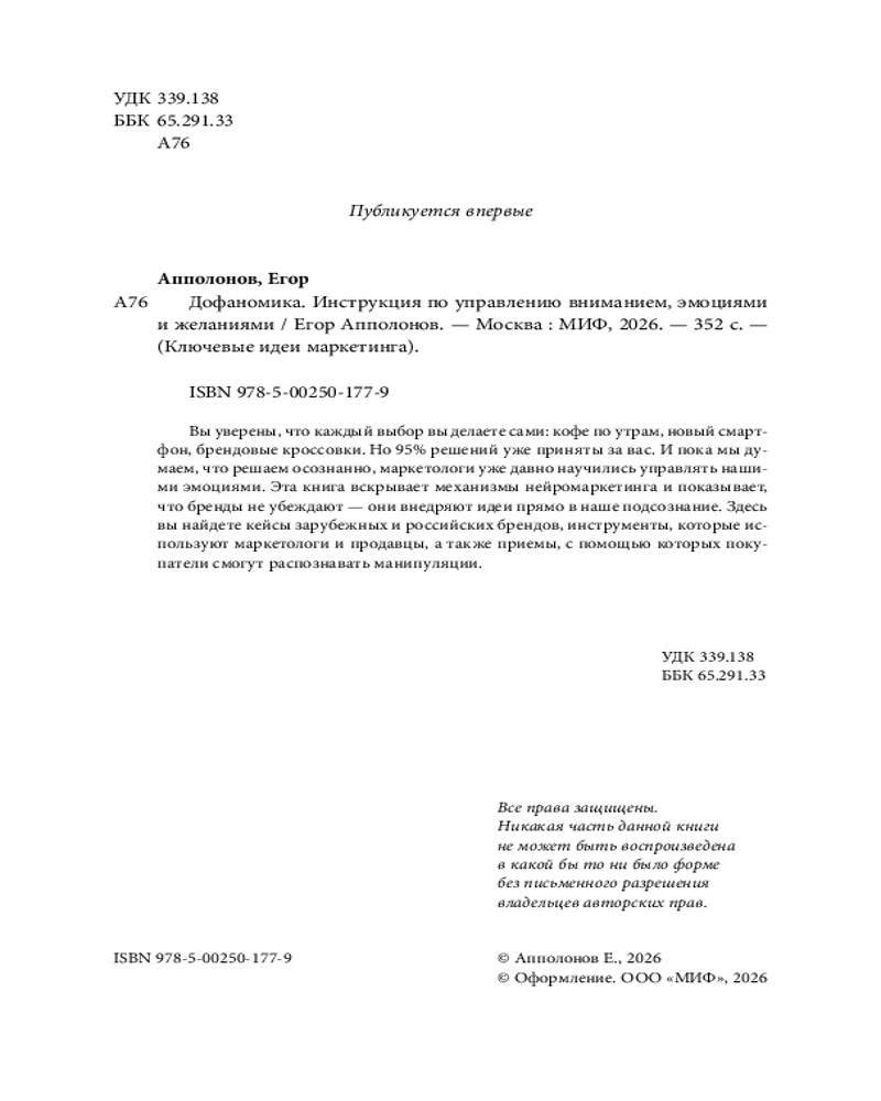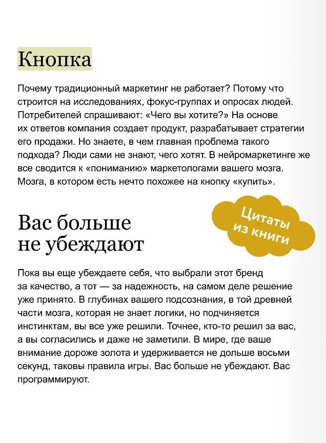 💳 Оплатить за товар можно при получении 🇰🇿 Есть бесплатная доставка по Казахстану 🎁 Копите бонусы с каждой покупки Серия: Ключевые идеи маркетинга Эта книга о том, как люди принимают решения: покупателям она поможет защититься от манипуляций, а маркетологам — использовать нейронауку, чтобы точнее воздействовать на решения людей. |