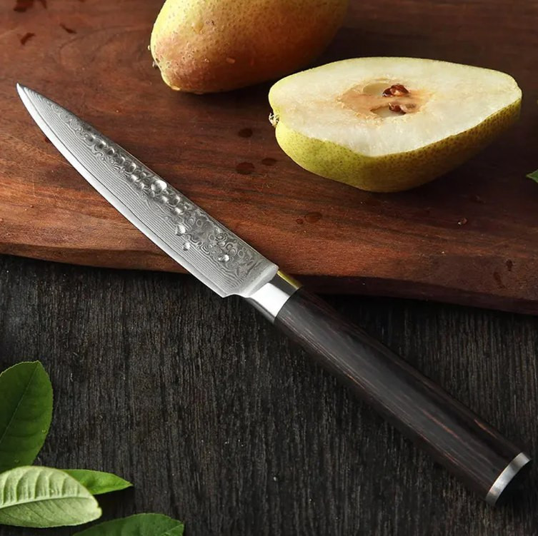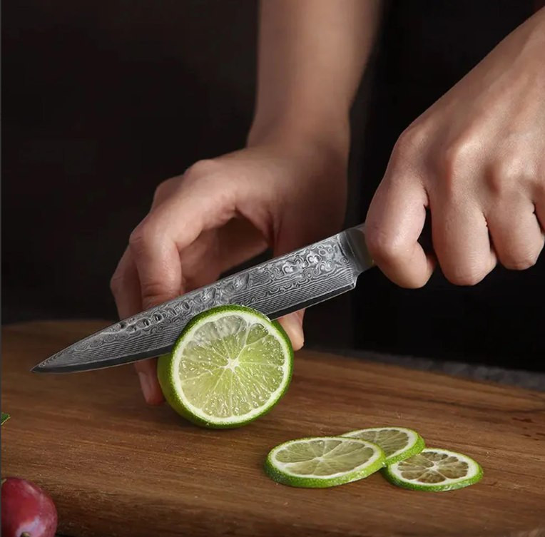 Разделочный поварской нож сочетает в себе уникальные режущие свойства и привлекательный внешний дизайн, который легко впишется в интерьер Вашей кухни. Рукоять из материала Pakkawood обеспечивает комфорт и прочность захвата, продлевает срок эксплуатации изделия. Режущая кромка выполнена из дамасской стали в 67 слоёв. С каждой стороны обкладка в 33 слоя из нержавеющей стали 316/316L, а в середине 10Cr15CoMoV. Такая технология производства гарантирует определенную степень гибкости клинка, при этом высокую прочность сердцевины. Угол заточки 15 градусов в каждую сторону позволяет получать ровные и тонкие куски, резать быстро и без особых усилий. Длина лезвия 12,9 см оптимальна при работе с различными продуктами небольшого размера.