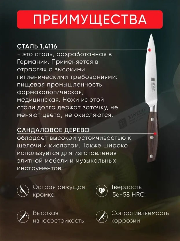 Универсальный острый кухонный нож подходит для нарезки любых продуктов: мяса, овощей, рыбы, фруктов, зелени, ветчины, сыра, но не подходит для рубки костей. Тонкий деликатный срез и мелкая шинковка обеспечивается за счет острого клинка. Благодаря качественным техническим характеристикам обеспечивается удобство и оперативность готовки, остается время для красивой сервировки блюд.