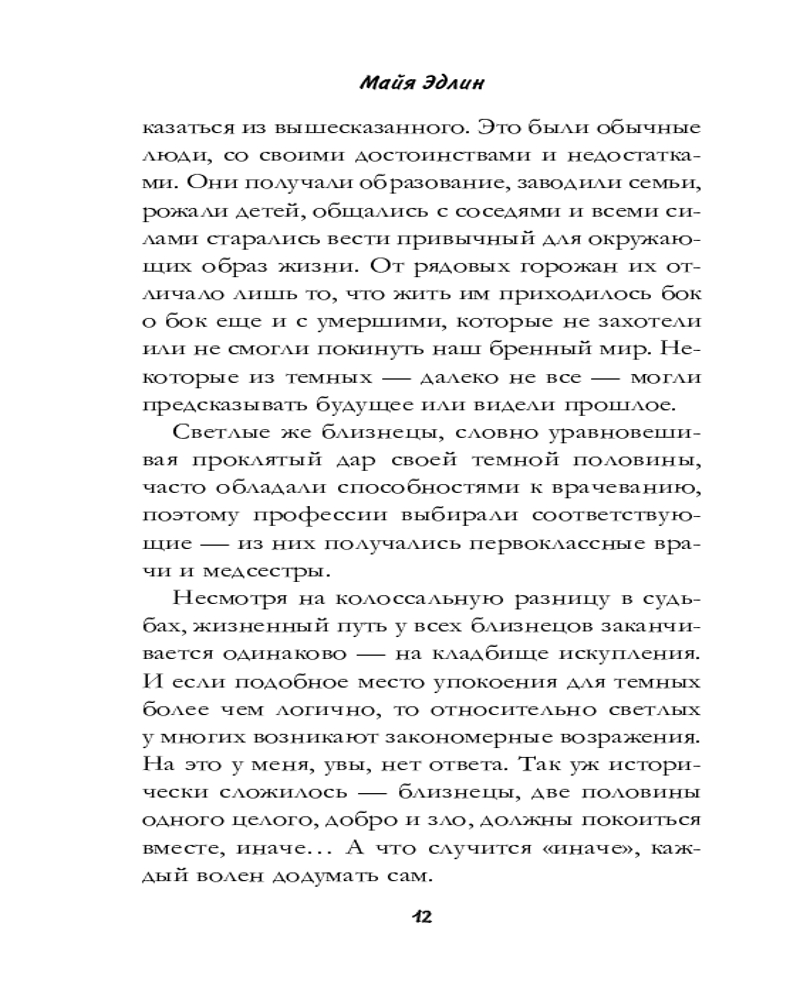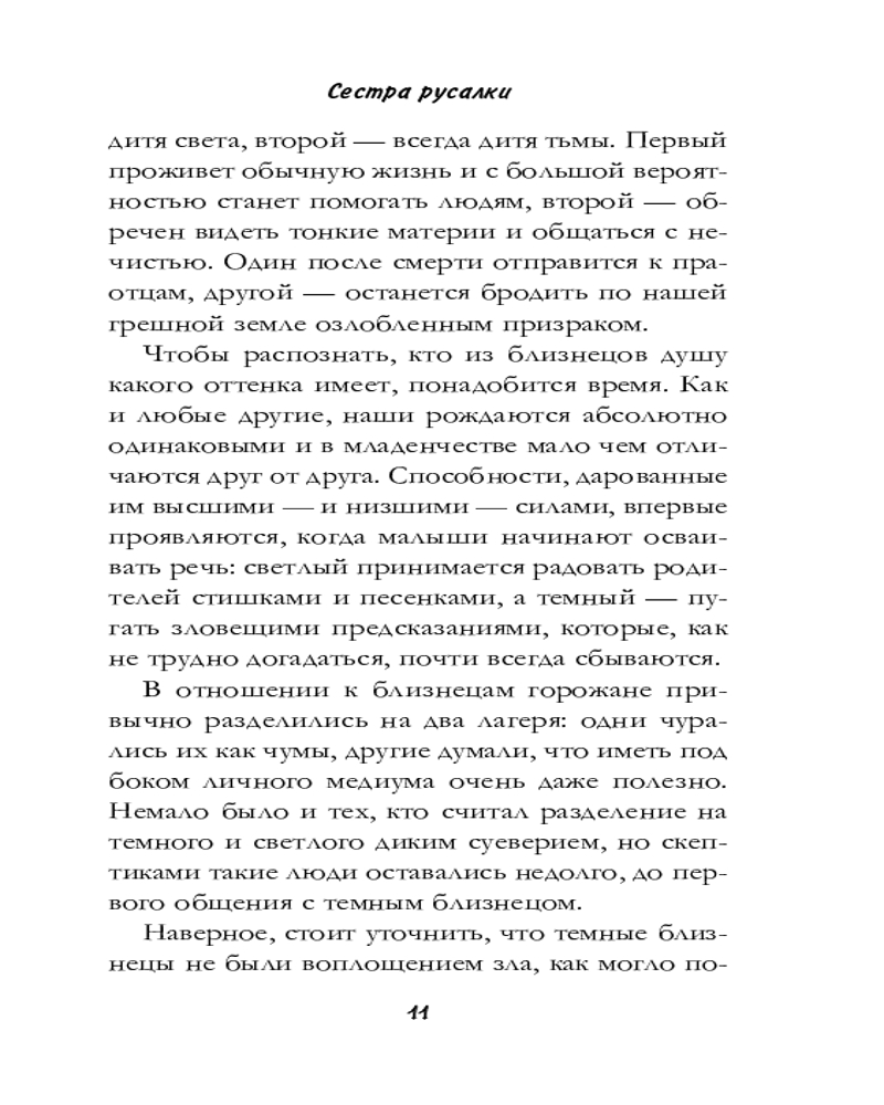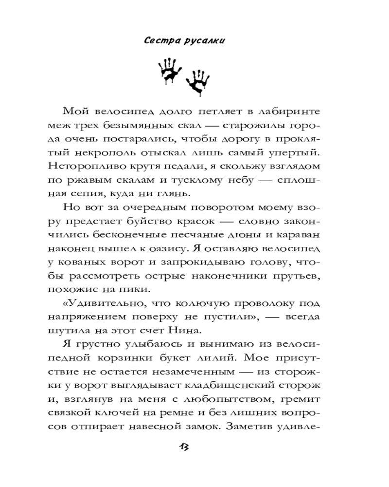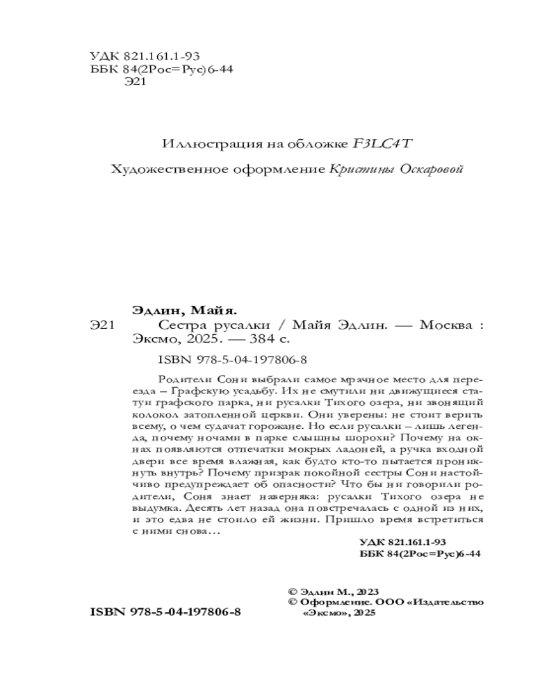 💳 Оплатить за товар можно при получении 🇰🇿 Есть бесплатная доставка по Казахстану 🎁 Копите бонусы с каждой покупки Серия: Сказки темного города Родители Сони выбрали самое мрачное место для переезда — Графскую усадьбу. Их не смутили ни движущиеся статуи графского парка, ни русалки Тихого озера, ни звонящий колокол затопленной церкви. Они уверены, не стоит верить всему, о чем судачат горожане. Но если русалки — лишь легенда, почему ночами в парке слышны шорохи? Почему на окнах появляются отпечатки мокрых ладоней, а ручка входной двери всё время влажная, как будто кто-то пытается проникнуть внутрь? Почему призрак покойной сестры Сони настойчиво предупреждает об опасности? Что бы ни говорили родители, Соня знает наверняка: русалки Тихого озера не выдумка. Десять лет назад она повстречалась с одной из них, и это едва не стоило ей жизни. Пришло время встретиться с ними снова... |