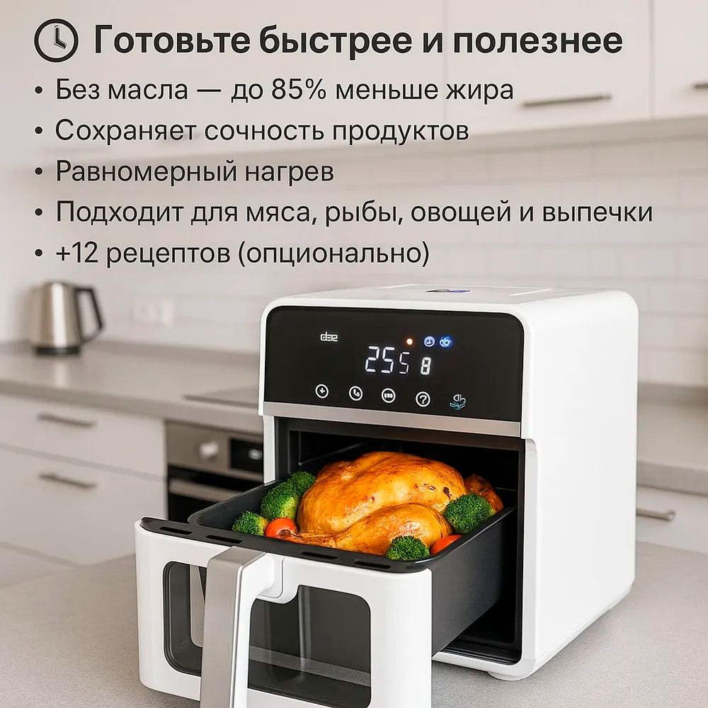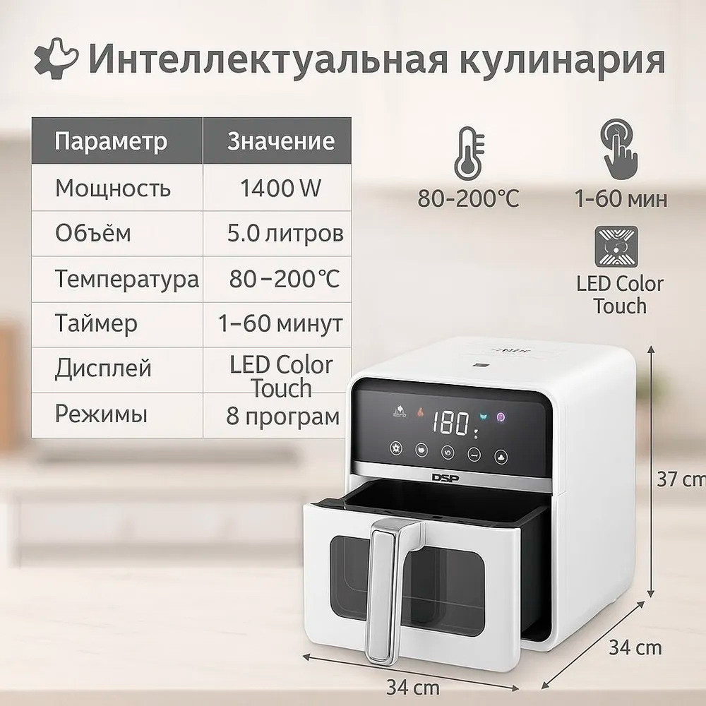 💳 Оплатить за товар можно при получении 🇰🇿 Есть бесплатная доставка по Казахстану 🎁 Копите бонусы с каждой покупки Аэрогриль DSP KB-2190 — это современное решение для здорового и быстрого приготовления блюд без использования масла. Оснащён мощным нагревательным элементом 1400 Вт и вместительной чашей 5 литров, прибор обеспечивает равномерную циркуляцию горячего воздуха, что позволяет готовить пищу до 85% менее жирной, сохраняя её сочность и естественный вкус. |