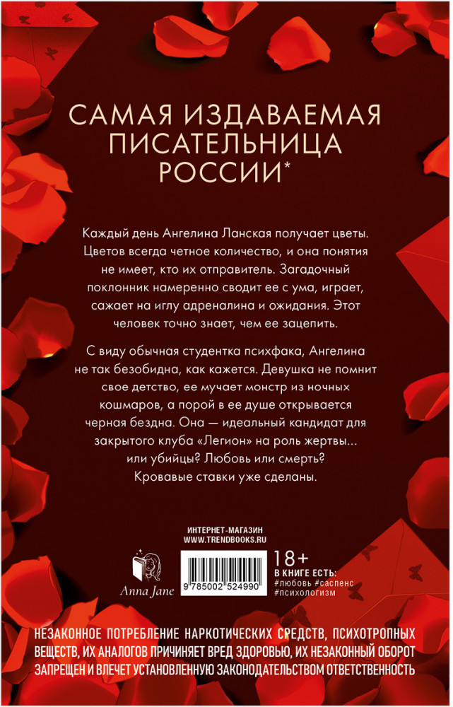 На первый взгляд, обычная студентка психфака, Ангелина не так безобидна, как кажется. Девушка не помнит свою жизнь до семи лет, ее мучает монстр из ночных кошмаров, а порой в ее душе открывается черная бездна. Она — отличный кандидат для закрытого клуба «Легион» на роль жертвы… или убийцы? Любовь или смерть? Кровавые ставки уже сделаны.