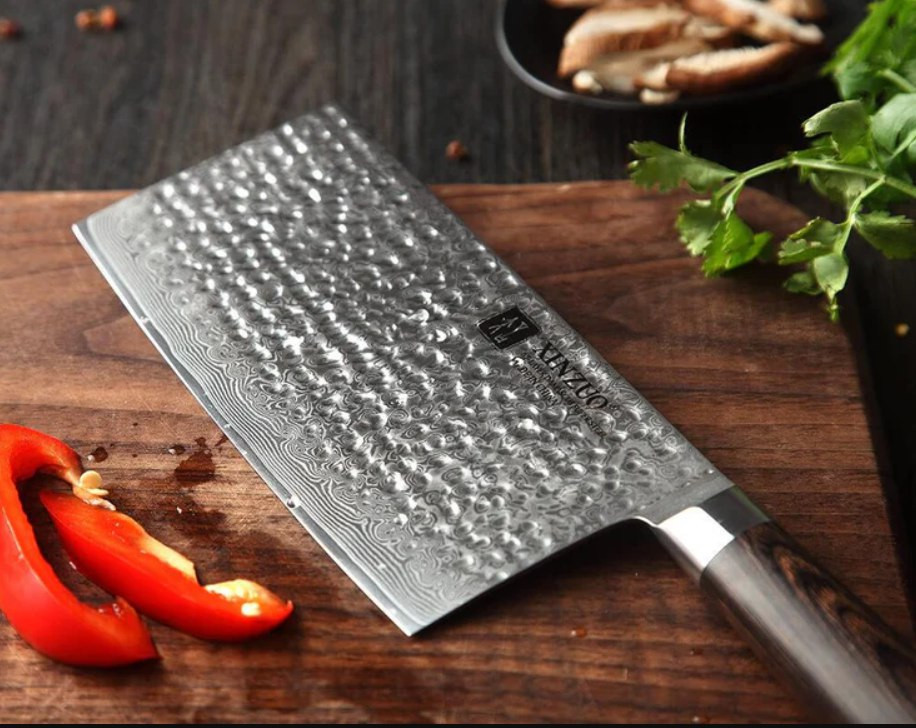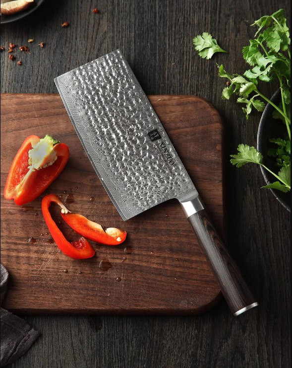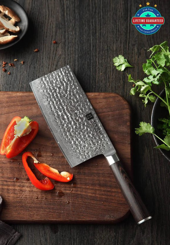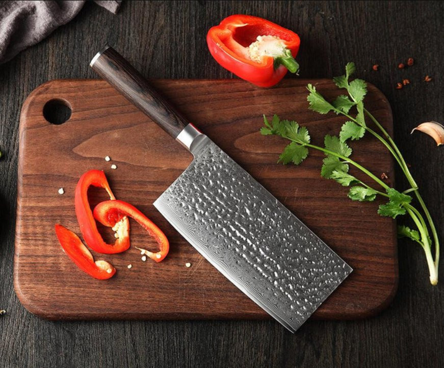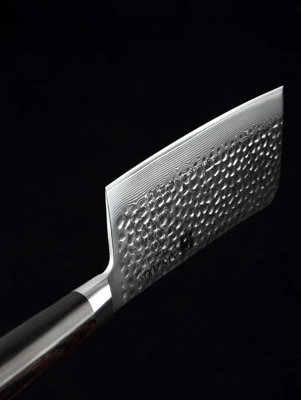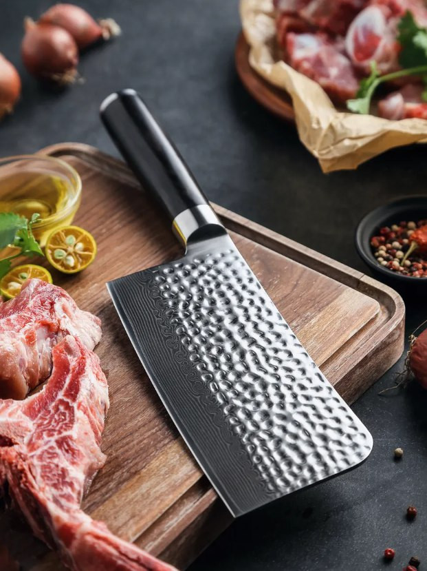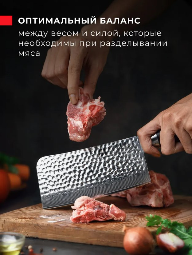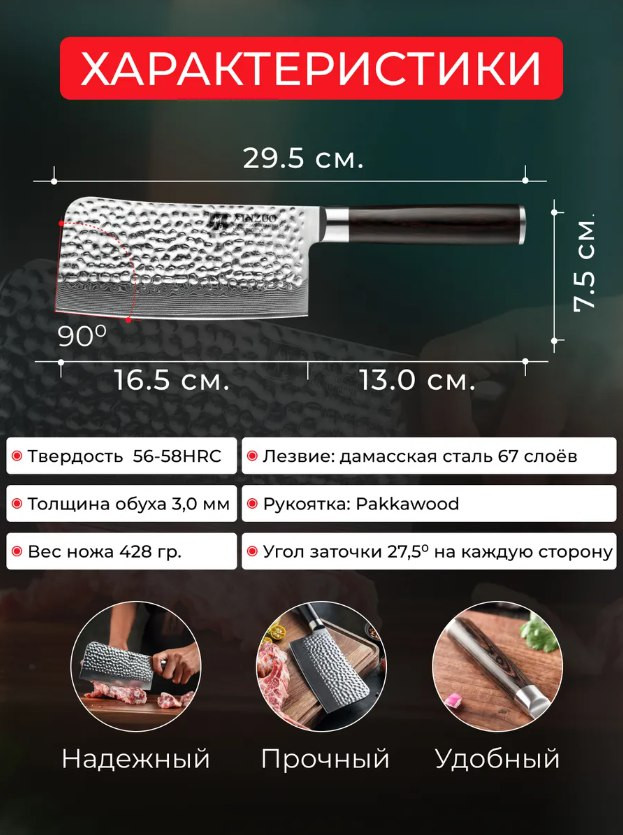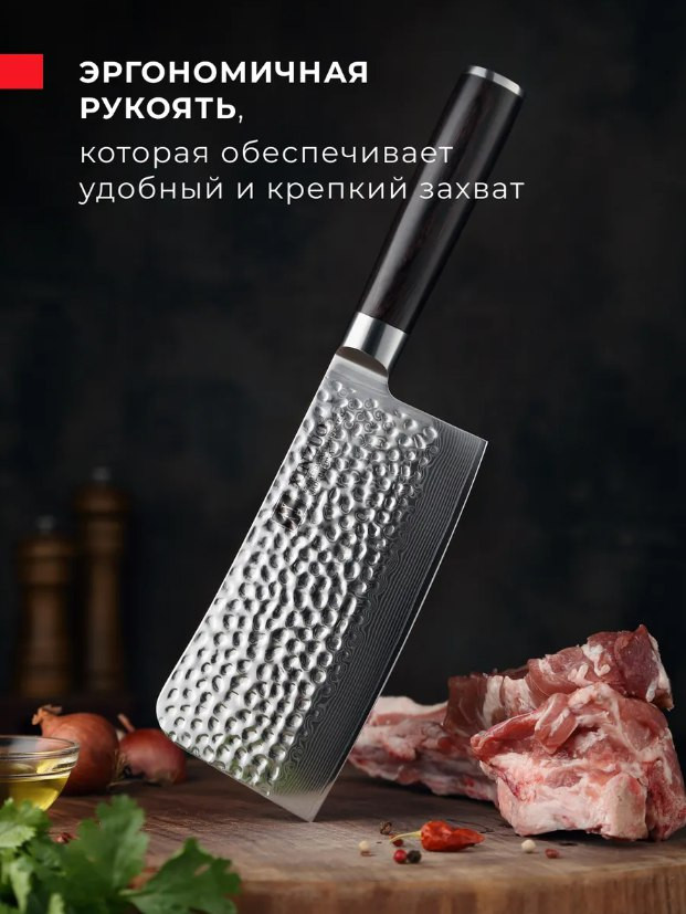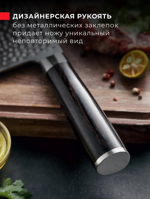 Разделочный нож изготовлен из дамасской стали в 67 слоёв. Каждая сторона лезвия содержит 33 слоя нержавеющей стали, которые защитят изделие от коррозии и механических повреждений. Сердцевину составляет сталь 10Cr15CoMoV, которая обладает достаточно высокой твердостью и хорошими режущими способностями. Оптимальная длина (20 см) режущей кромки позволяет нарезать любые продукты без особых усилий. А рукоять из Pakkawood обеспечит крепкий захват, исключит скольжение во время готовки.