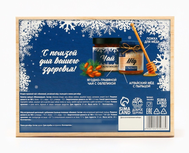 💳 Оплатить за товар можно при получении 🇰🇿 Есть бесплатная доставка по Казахстану 🎁 Копите бонусы с каждой покупки Напиток чайный «Облепиховый». Состав: облепиха (ягода), чага, яблоко зелёное, зверобой (трава), шиповник, кипрей (лист). Мёд натуральный цветочный с добавками (пыльца пчелиная: обножка). Состав: мёд натуральный цветочный, пыльца. Пищевая ценность на 100 г: углеводы — 79.7 г, белки — 1.7 г, жиры — 0.6 г. Энергетическая ценность на 100 г: 330.4 ккал/1383 кДж. Срок годности: 2 года. Масса нетто: 240 г. |