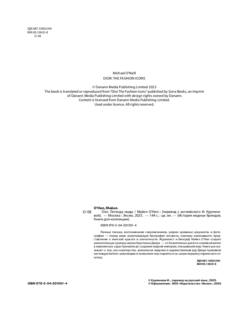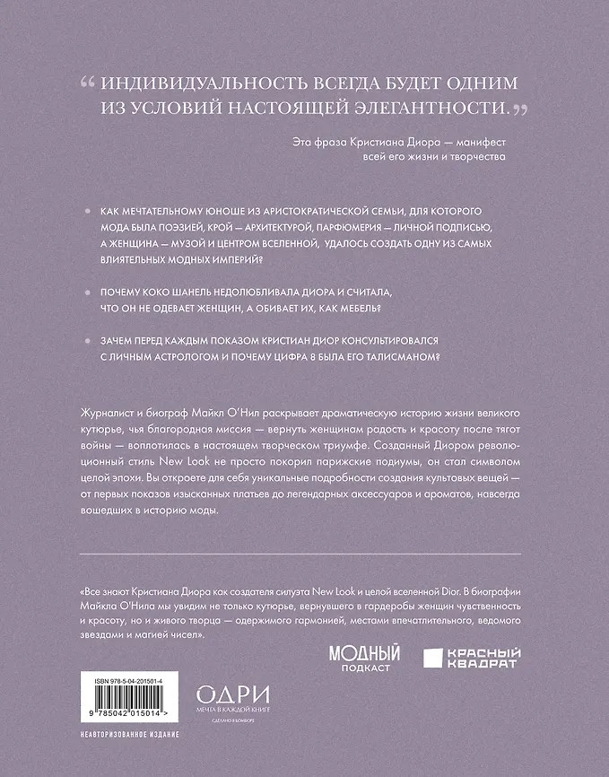 💳 Оплатить за товар можно при получении 🇰🇿 Есть бесплатная доставка по Казахстану 🎁 Копите бонусы с каждой покупки Серия: История модных брендов Захватывающая биография легендарного кутюрье, чья страсть к красоте и любовь к женщинам изменили мир моды навсегда. Журналист и биограф Майкл О’Нил создает увлекательную хронику жизни Кристиана Диора — от безмятежных дней на семейной вилле в живописных садах Гранвиля до создания модной империи. Книга рассказывает о том, как новаторство, уникальное видение и художественный дар Диора произвели настоящую модную революцию и позволили ему подняться на самую вершину парижского от-кутюр. Вы узнаете о тайных символах в коллекциях и личных талисманах кутюрье, которые помогали ему создавать неповторимые шедевры, откроете для себя уникальные подробности создания культовых вещей — от первых показов изысканных платьев до легендарных аксессуаров и ароматов, навсегда вошедших в историю моды. |