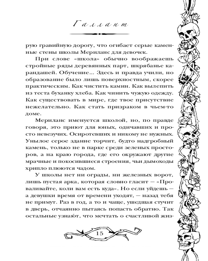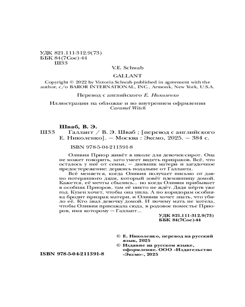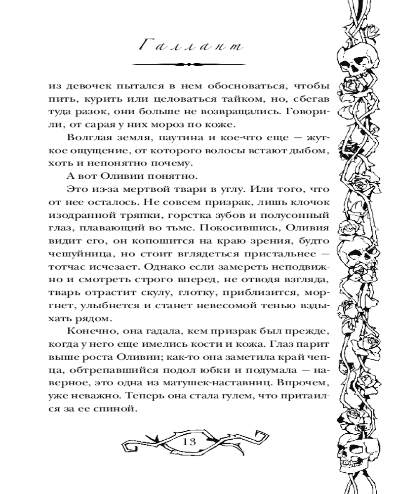 💳 Оплатить за товар можно при получении 🇰🇿 Есть бесплатная доставка по Казахстану 🎁 Копите бонусы с каждой покупки Серия: Хиты Young Adult. Коллекция Оливия Приор живёт в школе для девочек-сирот. Она не может говорить, зато умеет видеть призраков. Всё, что осталось у неё от семьи, — дневник матери и загадочное предостережение: держись подальше от Галланта. Всё меняется, когда Оливия получает письмо от давно потерянного дяди, который зовёт племянницу домой. Кажется, её мечты сбылись... Но когда Оливия прибывает в особняк Приоров, там её никто не ждёт. Дядя мёртв уже год. Кузен хочет, чтобы она ушла. А по коридорам особняка бродит призрак матери, и Оливия хочет знать, что убило её. Кто звал девочку домой. И почему мать не хотела, чтобы Оливия приезжала сюда, в родовое поместье Приоров, имя которому — Галлант... |