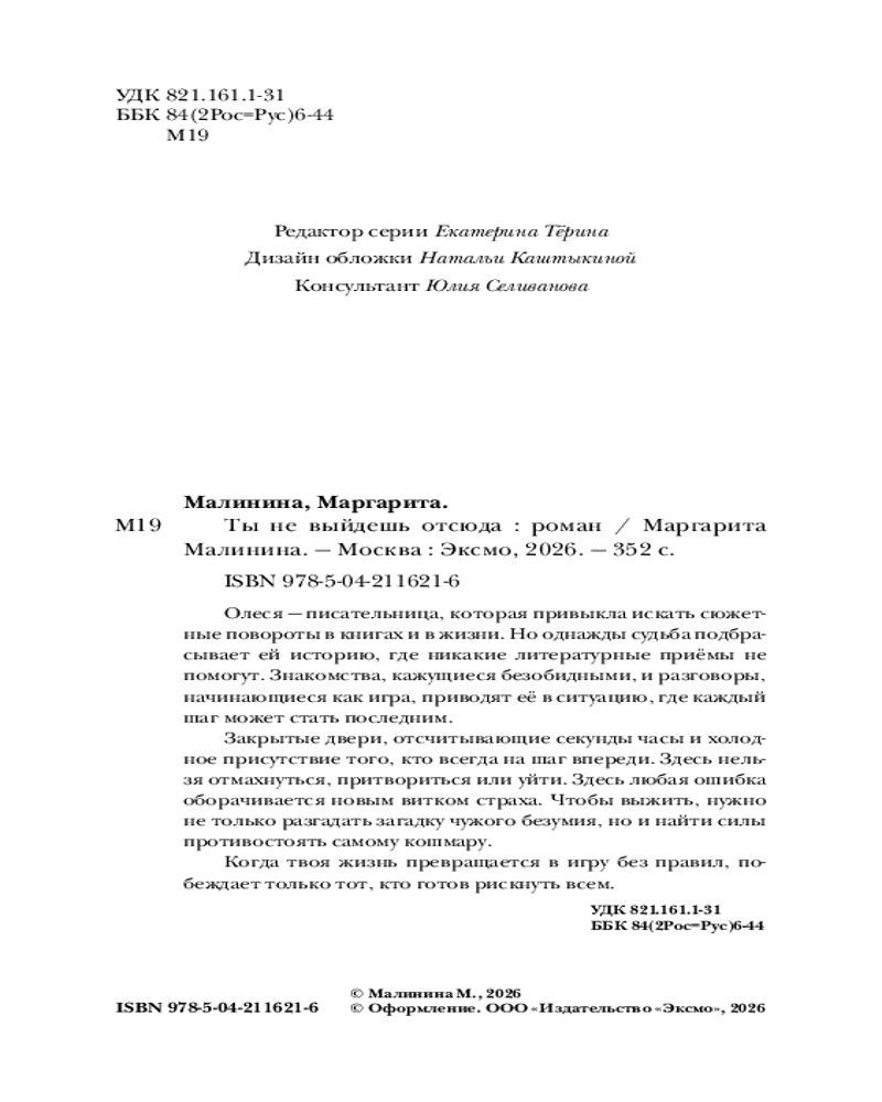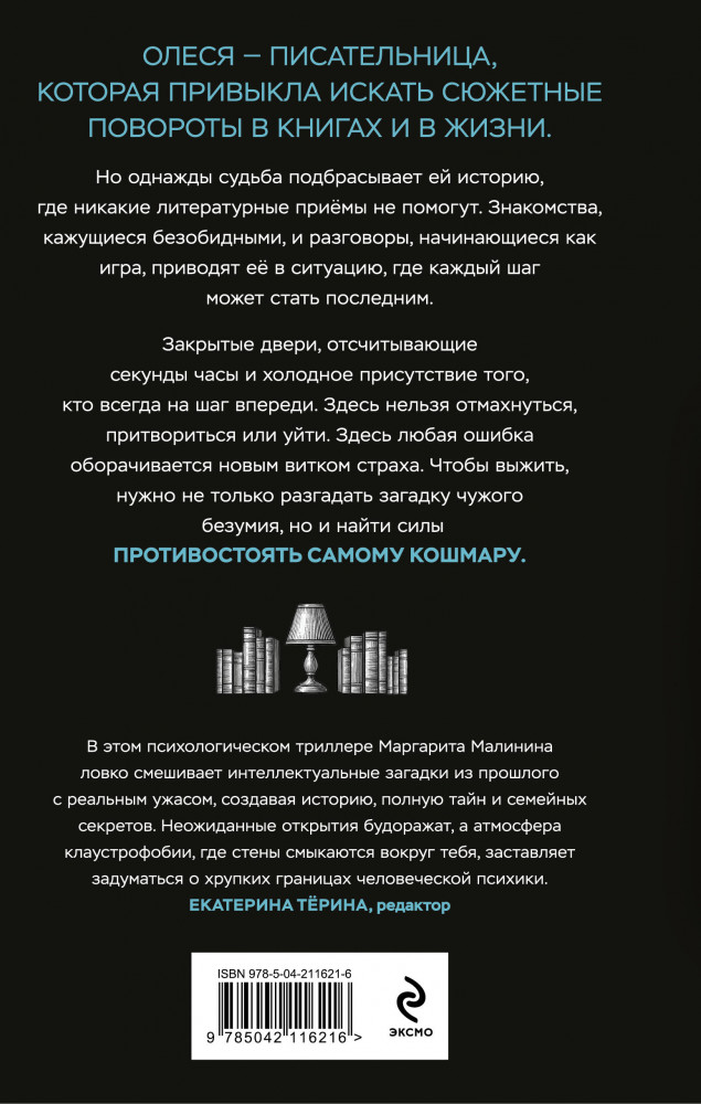 💳 Оплатить за товар можно при получении 🇰🇿 Есть бесплатная доставка по Казахстану 🎁 Копите бонусы с каждой покупки Серия: Выжить любой ценой. Психологический триллер Встреча в интернете кажется безобидной игрой — ровно до тех пор, пока ее правила не пишут другие. Писательница Олеся знакомится с обаятельным незнакомцем. Интеллектуальные загадки, легкие беседы, обещание поддержки и понимания — все это похоже на редкую удачу. Но очень скоро иллюзия рассыпается: за привлекательной внешностью и красивыми словами скрывается что-то куда более мрачное. Запертая в незнакомом доме, Олеся понимает: здесь никто не играет ради удовольствия. Каждая загадка — испытание на выживание, а каждый неверный ответ — шаг к смерти. Времени все меньше, а выхода нет. Когда доверие оборачивается ловушкой, единственная цель — дожить до следующей минуты. Но хватит ли сил бороться, если сама игра не имеет решения? |