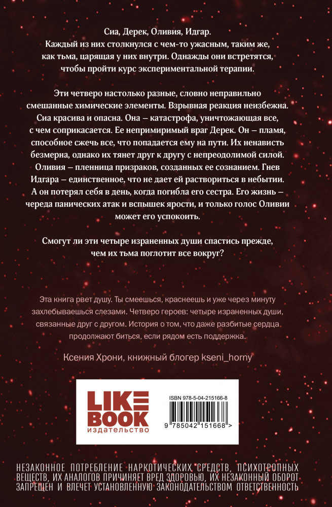💳 Оплатить за товар можно при получении 🇰🇿 Есть бесплатная доставка по Казахстану 🎁 Копите бонусы с каждой покупки Серия: Young Adult. Творец слез Сиа, Дерек, Оливия, Идгар. Каждый из них столкнулся с чем-то ужасным, таким же, как тьма, царящая у них внутри. Однажды они встретятся, чтобы пройти курс экспериментальной терапии. Эти четверо настолько разные, словно неправильно смешанные химические элементы. Взрывная реакция неизбежна. Сиа красива и опасна. Она — катастрофа, уничтожающая всё, с чем соприкасается. Её непримиримый враг — Дерек. Он — пламя, способное сжечь всё, что попадается ему на пути. Их ненависть безмерна, однако их тянет друг к другу с непреодолимой силой. Оливия — пленница призраков, созданных её сознанием. Гнев Идгара — единственное, что не даёт ей раствориться в небытии. А он потерял себя в день, когда погибла его сестра. Его жизнь — череда панических атак и вспышек ярости, и только голос Оливии может его успокоить. Смогут ли эти четыре израненные души спастись прежде, чем их тьма поглотит всё вокруг? |