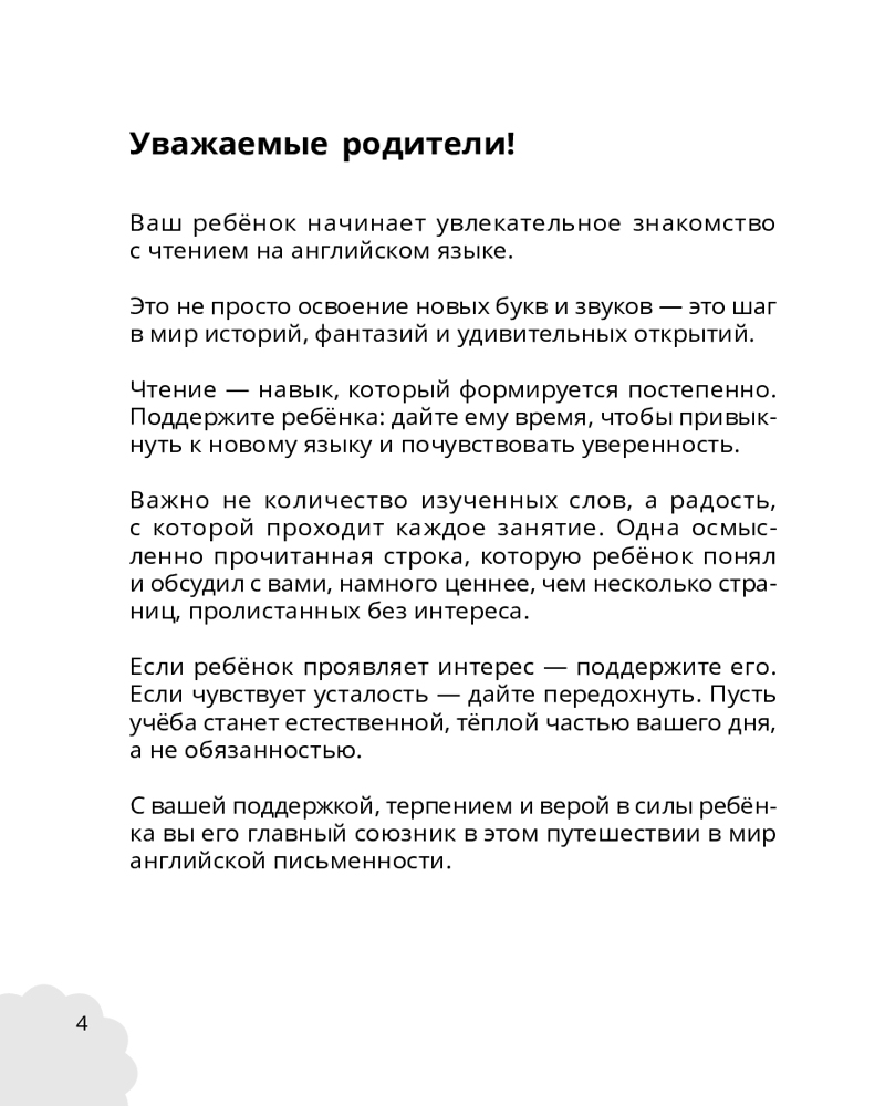 💳 Оплатить за товар можно при получении 🇰🇿 Есть бесплатная доставка по Казахстану 🎁 Копите бонусы с каждой покупки Серия: Английский для детей: учим с удовольствием шаг за шагом «Чтение на английском» — это увлекательное пособие, которое поможет ребенку сделать первые шаги в освоении навыка чтения на английском языке. Ребята будут учиться узнавать и правильно писать буквы, читать простые слова и предложения, а также расширять словарный запас. Игровые упражнения и занимательные задания превращают обучение в захватывающий процесс, развивая внимание, воображение и интерес к языку. Книга подойдет детям младшего школьного возраста и станет отличным помощником как для самостоятельных занятий дома, так и в качестве дополнения к школьной программе. |