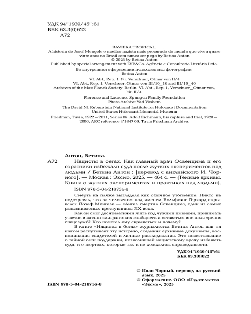 💳 Оплатить за товар можно при получении 🇰🇿 Есть бесплатная доставка по Казахстану 🎁 Копите бонусы с каждой покупки Серия: Темные архивы. Книги о жутких экспериментах и практиках над людьми Его боялись даже заключённые Освенцима: появление Йозефа Менгеле означало смерть или мучительные опыты. «Ангел смерти» решал судьбы тысяч узников, проводил чудовищные эксперименты и после войны стал одним из самых разыскиваемых преступников ХХ века. Но вместо суда он десятилетиями жил в Южной Америке. Сначала — открыто, в кругу бывших эсэсовцев, которых защищал аргентинский диктатор Перон. Позже — в бегах, пользуясь поддержкой своей семьи и тайных покровителей. Его укрывали те, кто прекрасно знал, кем он был. Среди этих людей оказалась и школьная учительница Бетины Антон — автора книги. Почему охотники за нацистами так и не смогли его поймать? Кто помогал ему скрываться? И почему правда открылась лишь после его смерти? |
