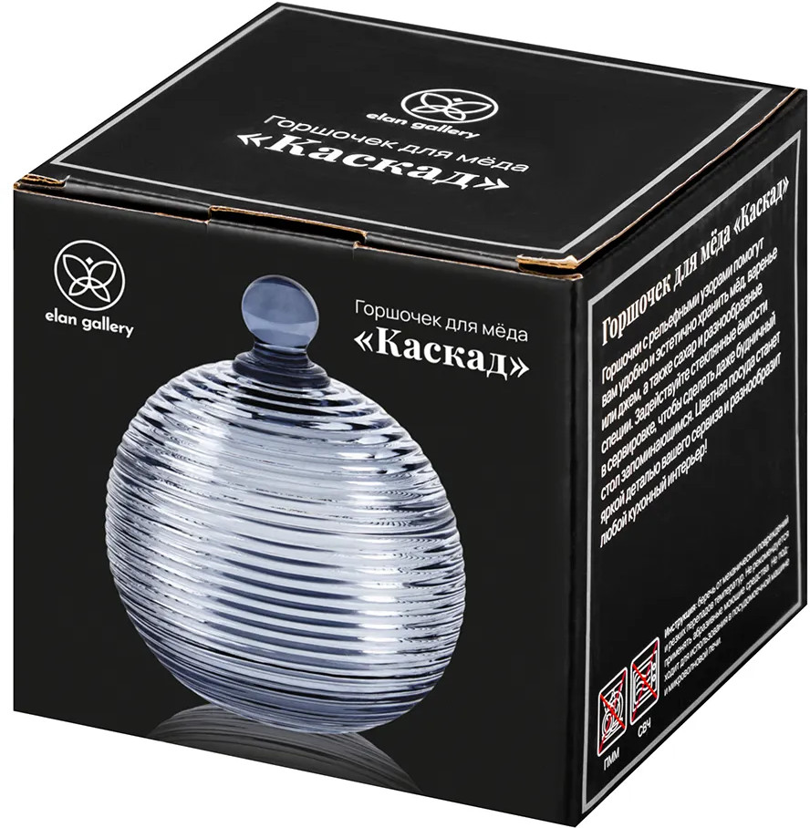 Горшочек для мёда из серии «Каскад» от Elan Gallery послужит для организации хранения продуктов на вашей кухне. Размер ёмкости — 10,7×10,7×13,5 см, объём — 300 мл. Высота без крышки — 7 см. Выполнен из стекла и украшен рельефом в виде полос, напоминающих плавно стекающие потоки воды. Декоративная баночка круглой формы станет гармоничным дополнением при сервировке вашего стола как в будни, так и в праздник. Красивый дизайн и изысканный синий цвет позволят использовать её не только для хранения, но и для подачи к столу. Заполните ёмкость сахаром и солью, специями и приправами, чтобы во время приготовления и приёма пищи всё необходимое было под рукой. Засыпьте внутрь чай или кофе, чтобы в любой момент заварить свежий напиток. Храните в ней закуски и сладости: ягоды, орехи и сухофрукты, леденцы и конфеты. Подайте джем, варенье или соус. Используйте в качестве медовницы или икорницы, чтобы удивить гостей необычной сервировкой.