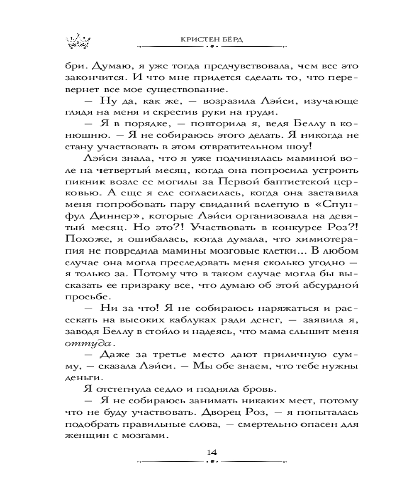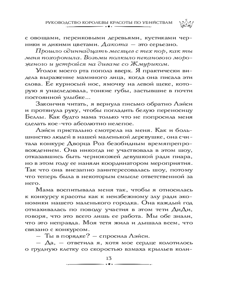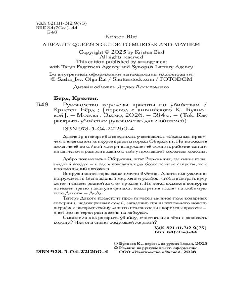 💳 Оплатить за товар можно при получении 🇰🇿 Есть бесплатная доставка по Казахстану 🎁 Копите бонусы с каждой покупки Серия: Tok. Как раскрыть убийство: руководство для любителей Дакота Грин скорее бы согласилась участвовать в «Голодных играх», чем в ежегодном конкурсе красоты города Оберджин. Но последнее желание покойной матери вынуждает её сменить рабочие сапоги на шпильки и раскрыть давнюю тайну пропавшей королевы красоты. Добро пожаловать в Оберджин, штат Вирджиния, где синие горы, сладкий воздух — и где у красавиц куда более тёмные секреты, чем прошлогодний автозагар. |