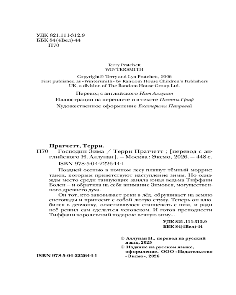 💳 Оплатить за товар можно при получении 🇰🇿 Есть бесплатная доставка по Казахстану 🎁 Копите бонусы с каждой покупки Серия: Магия Терри Пратчетта в иллюстрациях Полины Граф Поздней осенью в ночном лесу пляшут тёмный моррис: танец, которым приветствуют наступление зимы. Но однажды место среди танцующих заняла юная ведьма Тиффани Болен — и обратила на себя внимание Зимовея, могущественного древнего духа. Он тот, кто заковывает реки в лёд, обрушивает на землю снегопады и приносит с собой лютую стужу. Теперь он влюбился в девчонку, осмелившуюся станцевать с ним, и ради неё решил сам сделаться человеком. И готов преподнести Тиффани королевский подарок: вечную зиму... |
