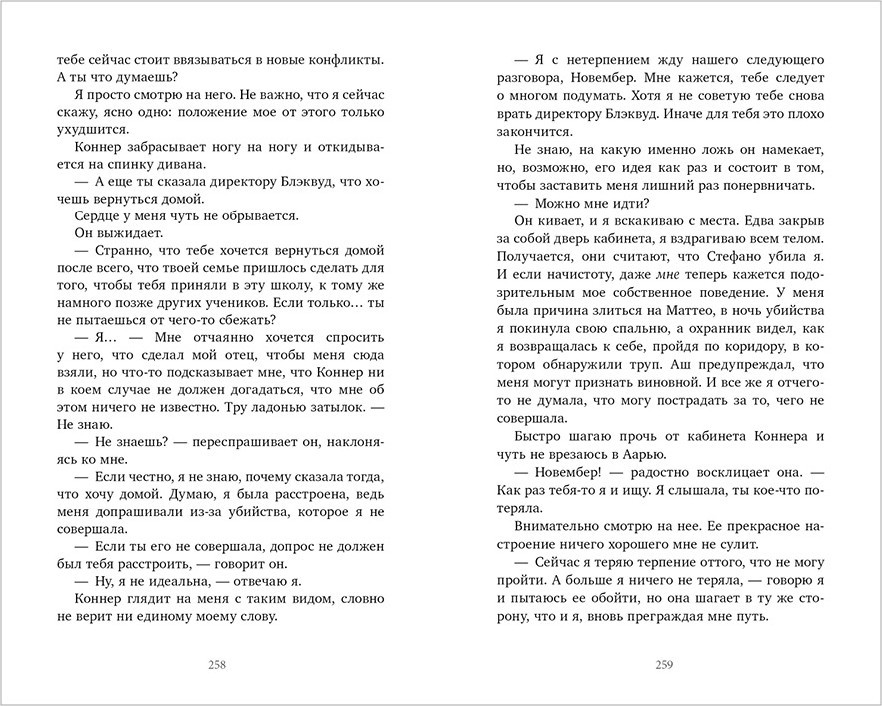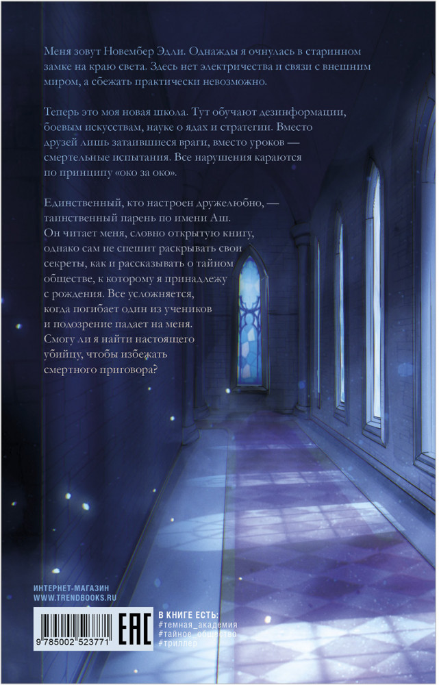 Однажды Новембер Эдли очнулась в старинном замке на краю света. Теперь это ее новая школа? Без электричества, связи с внешним миром и возможности вернуться домой. В загадочной академии обучают манипулированию, боевым искусствам, науке о ядах. Вместо друзей — затаившиеся враги, вместо уроков — смертельные испытания. Единственный, кто настроен дружелюбно, — таинственный парень по имени Аш. Но он тоже что-то скрывает. Все усложняется, когда погибает один из учеников и подозрение падает на Новембер. Сможет ли она найти настоящего убийцу, чтобы избежать смертного приговора и раскрыть тайны академии?
