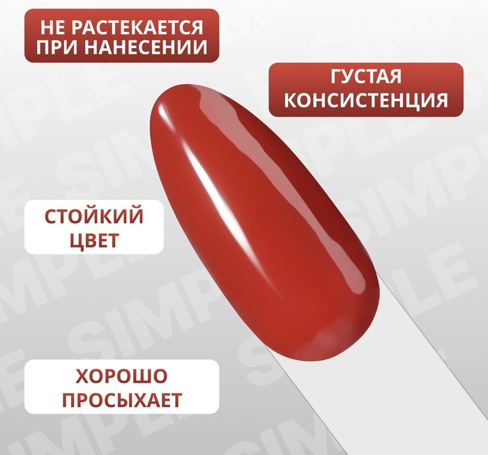 Привлекательная палитра оттенков трехфазных гель-лаков серии «Simple». Палитра серии объединила в себе спокойные и яркие цвета, которые можно дополнять декором и делать маникюр ещё более привлекательным. Такое покрытие придаст образу изюминку и не оставит Вас незамеченной. С этой палитрой гель-лаков Вы можете сочетать цвета из серии «Nude Color Glow», чтобы добавить акцент в дизайн маникюра. Для более оригинального и яркого дизайна Вы можете воспользоваться оттенками лаков из серии «Color Chrome». Гель-лак, в отличии от обычного лака, имеет большое количество преимуществ — он прост в использовании, дольше держится и поддерживает ногти в ухоженном состоянии, а также быстрее высыхает, благодаря сушке лампе (UV и LED-лампах).