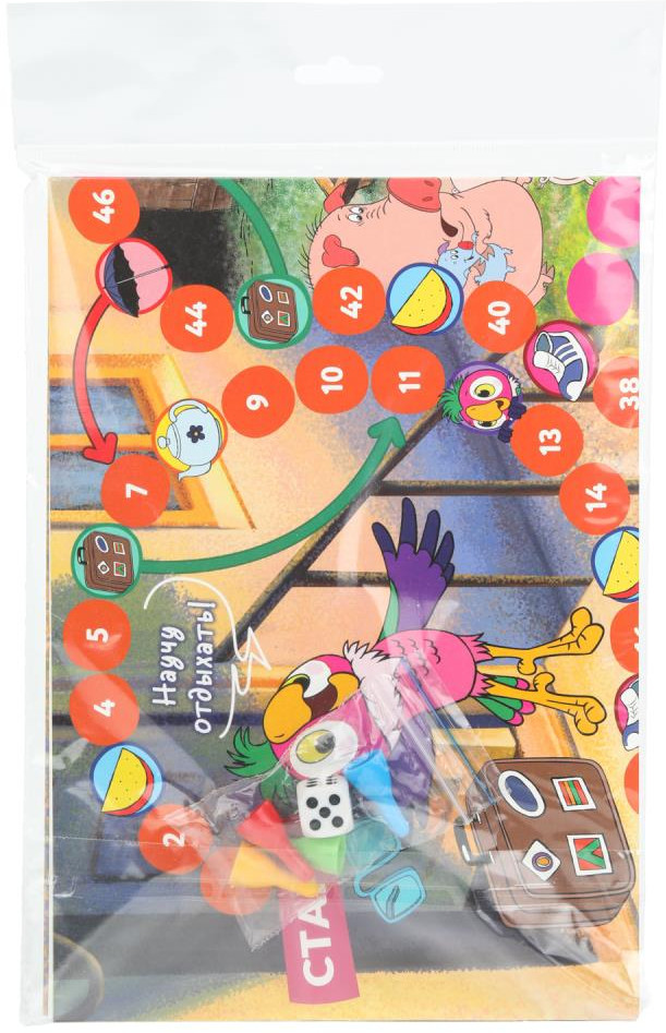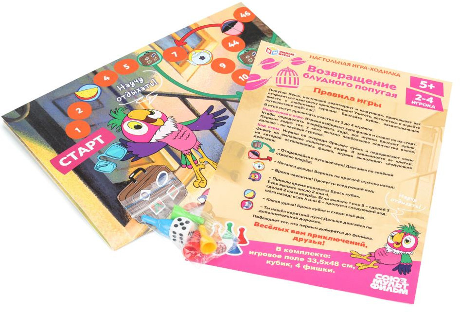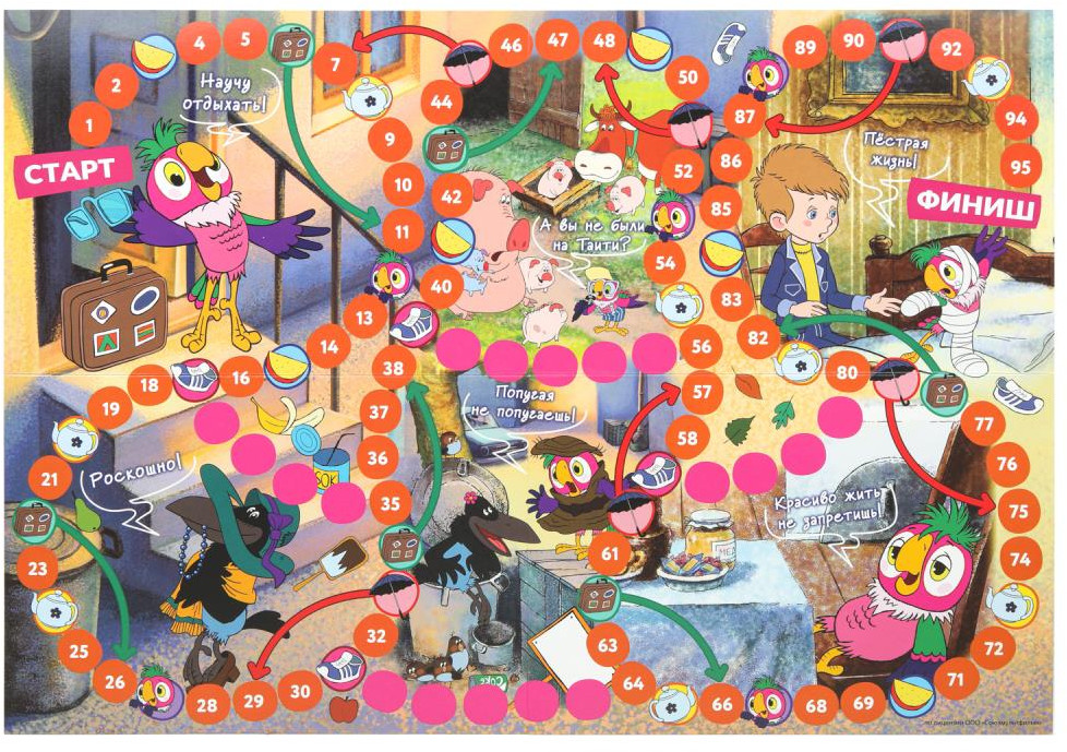 💳 Оплатить за товар можно при получении 🇰🇿 Есть бесплатная доставка по Казахстану 🎁 Копите бонусы с каждой покупки Серия: Союзмультфильм Настольная игра-ходилка на блистере «Союзмультфильм. Возвращение блудного попугая» ТМ «Умные игры» приглашает отправиться навстречу приключениям вместе с любимыми героями! Попугай Кеша, настоящий авантюрист и выдумщик, приглашает в увлекательную игру с элементами обучения. Учитесь, веселитесь и играйте вместе с персонажами известного мультфильма. Бросайте кубик, вас ждёт захватывающее путешествие! Чтобы определить очерёдность хода, игроки бросают кубик. Первым ходит тот, у кого выпало наибольшее количество очков, дальше — по часовой стрелке. В процессе этой весёлой игры участникам нужно бросать кубик и передвигать свои фишки по игровому полю на выпавшее количество ходов. В зависимости от поля, на котором остановится фишка, игрокам предстоит выполнять разные действия: двигаться по зелёной стрелке вперёд; возвращаться по красной стрелке назад; пропускать ход; дополнительно бросать кубик и смотреть, какой сюрприз принесёт то или иное количество очков на нём; двигаться по дополнительной дорожке, сокращая путь к победе! Побеждает игрок, который первым доберётся до финиша. |