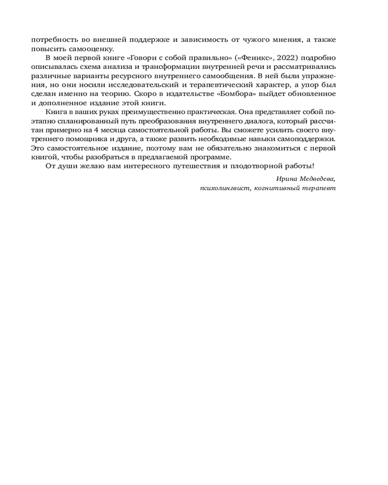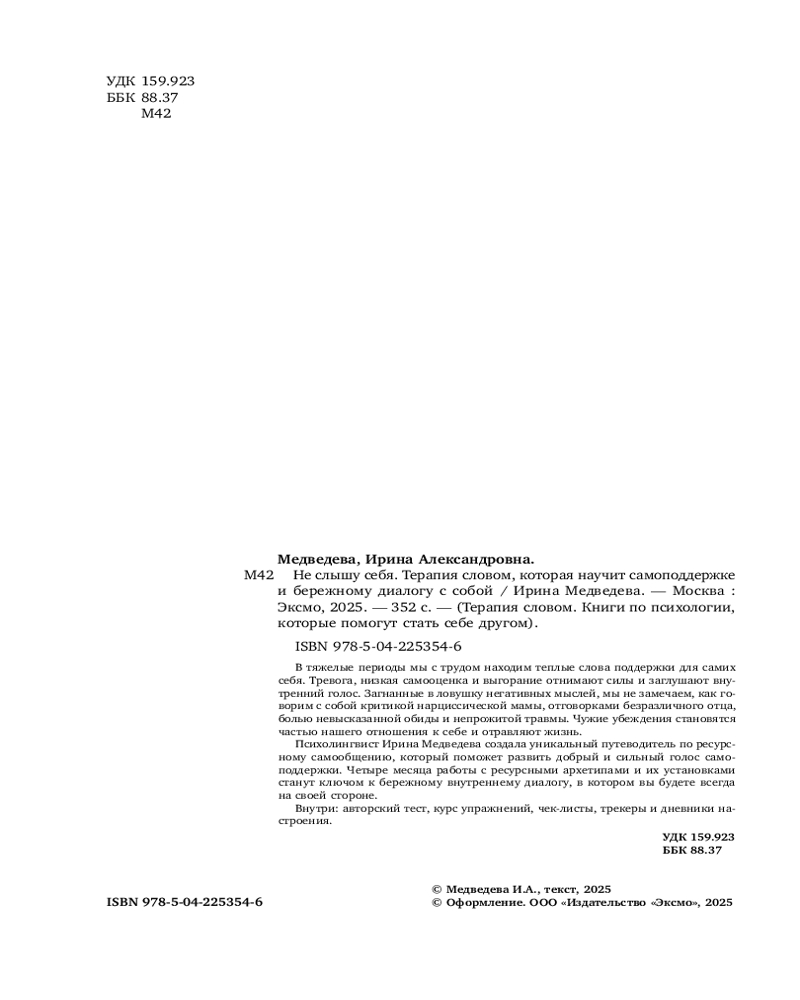 💳 Оплатить за товар можно при получении 🇰🇿 Есть бесплатная доставка по Казахстану 🎁 Копите бонусы с каждой покупки Серия: Терапия словом. Книги по психологии, которые помогут стать себе другом В тяжелые периоды мы с трудом находим теплые слова поддержки для самих себя. Тревога, низкая самооценка и выгорание отнимают силы и заглушают внутренний голос. Загнанные в ловушку негативных мыслей, мы не замечаем, как говорим с собой критикой нарциссической мамы, отговорками безразличного отца, болью невысказанной обиды и непрожитой травмы. Постепенно чужие убеждения становятся частью нашего отношения к себе и отравляют жизнь. |