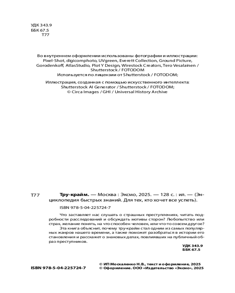 💳 Оплатить за товар можно при получении 🇰🇿 Есть бесплатная доставка по Казахстану 🎁 Копите бонусы с каждой покупки Серия: Энциклопедия быстрых знаний (обложка) Тру-крайм — одно из ярких явлений современной культуры. Миллионы людей слушают подкасты, смотрят документальные сериалы и читают истории о реальных преступлениях. Но откуда взялся этот жанр и почему он вызывает такой отклик? Эта книга поможет разобраться в том, что такое тру-крайм и как он работает: в ней вы найдете краткий обзор истории жанра, узнаете о ключевых делах, послуживших основой для его возникновения, а также познакомитесь с особенностями его форм — от газетных хроник до подкастов. Вы узнаете, как реальные преступления превращаются в культурный феномен и что стоит за желанием людей изучать темную сторону человеческой натуры. |