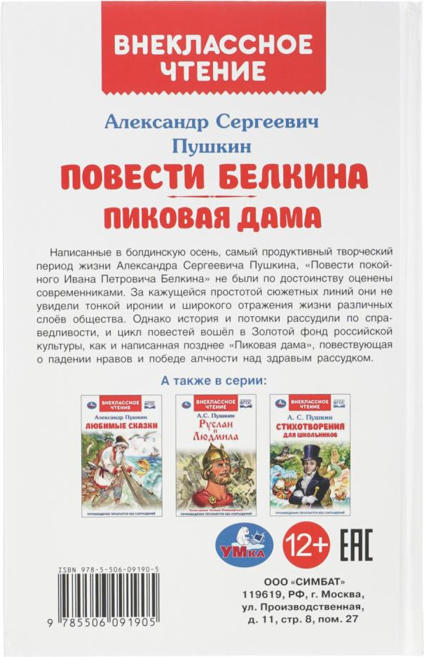 💳 Оплатить за товар можно при получении 🇰🇿 Есть бесплатная доставка по Казахстану 🎁 Копите бонусы с каждой покупки Серия: Внеклассное чтение Книга «А. С. Пушкин. Повести Белкина. Пиковая дама» из серии «Внеклассное чтение» ТМ «УМка» — отличный вариант для самостоятельного чтения вне занятий в школе. Написанные в болдинскую осень, самый продуктивный творческий период жизни Александра Сергеевича Пушкина, «Повести покойного Ивана Петровича Белкина» не были по достоинству оценены современниками. За кажущейся простотой сюжетных линий они не увидели тонкой иронии и широкого отражения жизни различных слоёв общества. Однако история и потомки рассудили по справедливости, и цикл повестей вошёл в Золотой фонд российской культуры, как и написанная позднее «Пиковая дама», повествующая о падении нравов и победе алчности над здравым рассудком. Благодаря компактному размеру издание удобно брать с собой в путешествие, чтобы скоротать время в дороге за увлекательным чтением. Чтение книг из серии «Внеклассное чтение» ТМ «УМка» расширяет кругозор и развивает: образное мышление, визуальное восприятие, внимание, память и речь. |