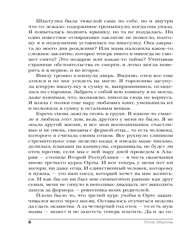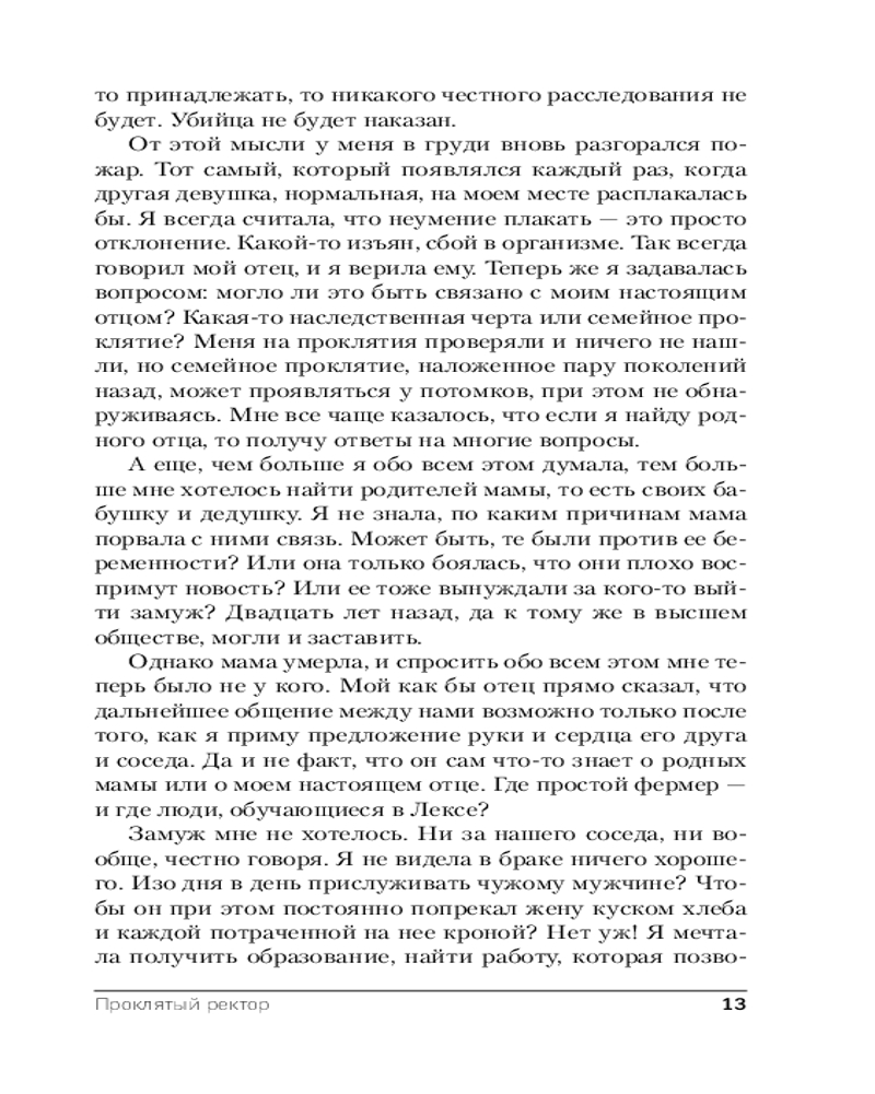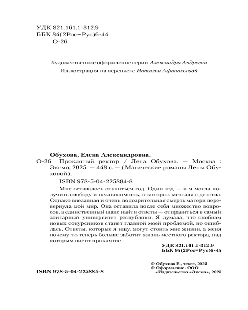 💳 Оплатить за товар можно при получении 🇰🇿 Есть бесплатная доставка по Казахстану 🎁 Копите бонусы с каждой покупки Серия: Магические романы Лены Обуховой «Проклятый ректор» — вторая книга магического цикла Лены Обуховой «Академии за Занавесью». Герои автора — как всегда неординарные, загадочные и очень обаятельные люди. Последний год в Орте, и Тара обретет заветную свободу. Но странная смерть мамы рушит все ее планы. Оказывается, у покойной было очень много тайн. Следы ведут в Лекс — старинный элитный университет. И, чтобы приблизиться к разгадке, Тара, не задумываясь, переводится в это пафосное заведение. Вот только она не подозревает, какие опасности и сюрпризы ее там ожидают. |