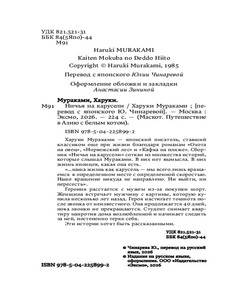 💳 Оплатить за товар можно при получении 🇰🇿 Есть бесплатная доставка по Казахстану 🎁 Копите бонусы с каждой покупки Серия: Маскот. Путешествие в Азию с белым котом Харуки Мураками — японский писатель, ставший классиком еще при жизни благодаря романам «Охота на овец», «Норвежский лес» и «Кафка на пляже». Сборник «Ничья на карусели» соткан из множества историй, которые слышал Мураками. В них нет вымысла. В них жизнь японцев, какая она есть. |