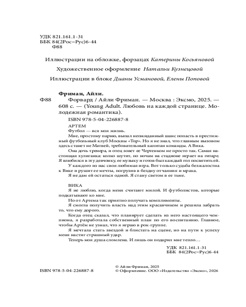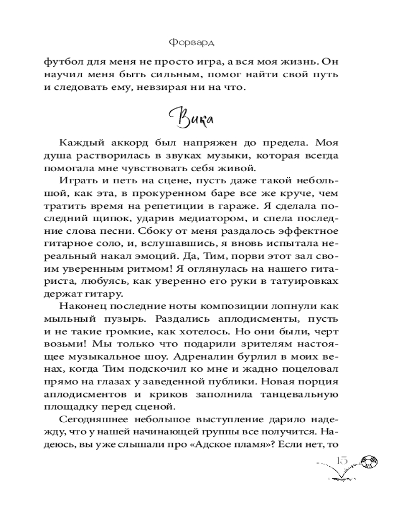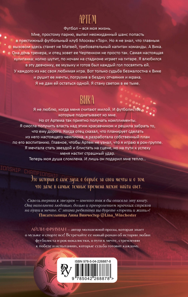 💳 Оплатить за товар можно при получении 🇰🇿 Есть бесплатная доставка по Казахстану 🎁 Копите бонусы с каждой покупки Серия: Young Adult. Любовь на каждой странице. Молодежная романтика Артём — футболист с тяжёлым прошлым, настойчивый и эмоциональный. Влюбившись в Вику, он готов на всё ради неё, даже бросить вызов собственным страхам. Вика — талантливая певица, дерзкая, но ранимая. Серьезная трагедия рушит все ее планы, забирает надежду на успех. Но Артём не сдаётся, его упрямство и преданность Вике помогают возлюбленной снова «гореть и жить». Музыка становится для девушки спасением, а любовь к нему заставляет снова поверить в себя. |