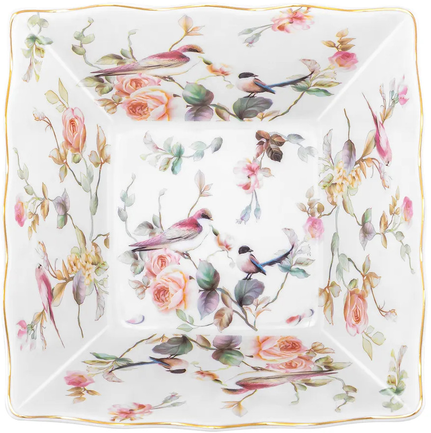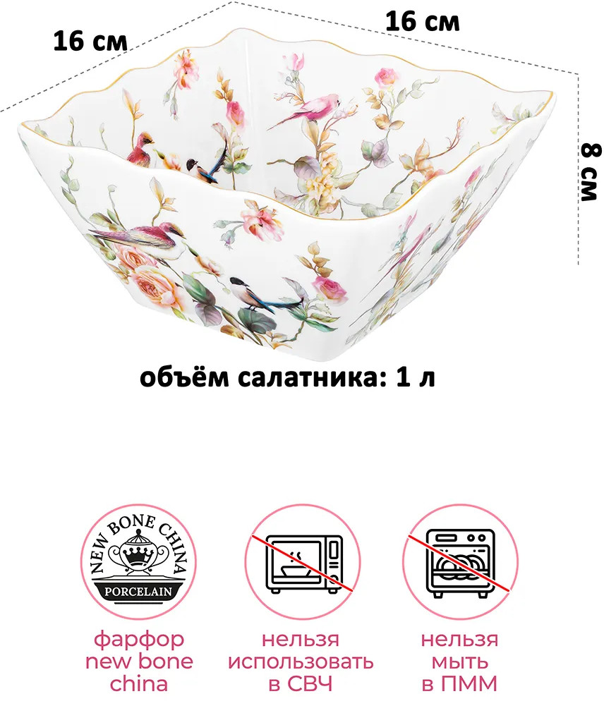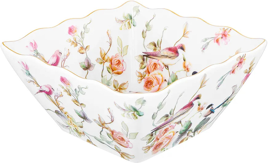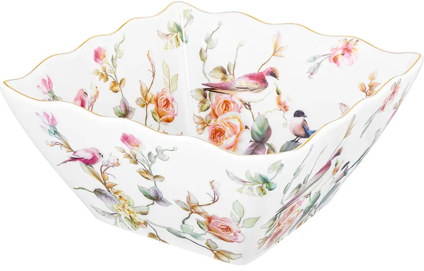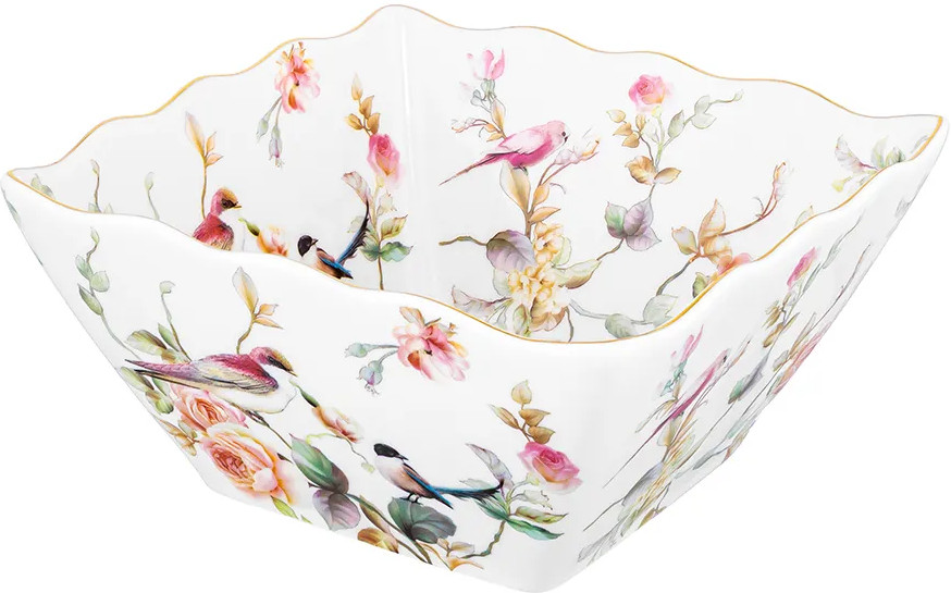 Салатник из серии «Певчие птички» от Elan Gallery станет идеальным решением для любителей здорового образа жизни и красивой сервировки стола. Размер изделия — 16×16×8 см, объём — 1 литр. Размер дна — 9,5×9,5 см. Выполнен из фарфора нового поколения new bone china, сочетающего в себе изящность и высокую прочность. Такие изделия легко отмываются, поэтому сохраняют привлекательный вид и практичны в использовании. От других видов костяного фарфора new bone china отличается большей экологичностью в производстве. С внешней и внутренней стороны изделие украшено рисунком пёстрых птичек и пышных бутонов роз. Они выполнены в манере, вдохновлённой акварельным рисунком. Тонкая золотистая окантовка служит деликатным акцентом и подчёркивает их изысканность.