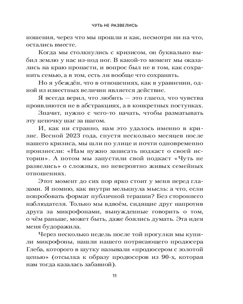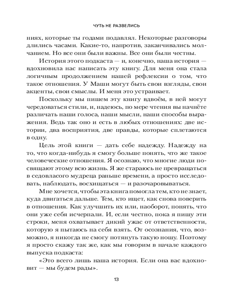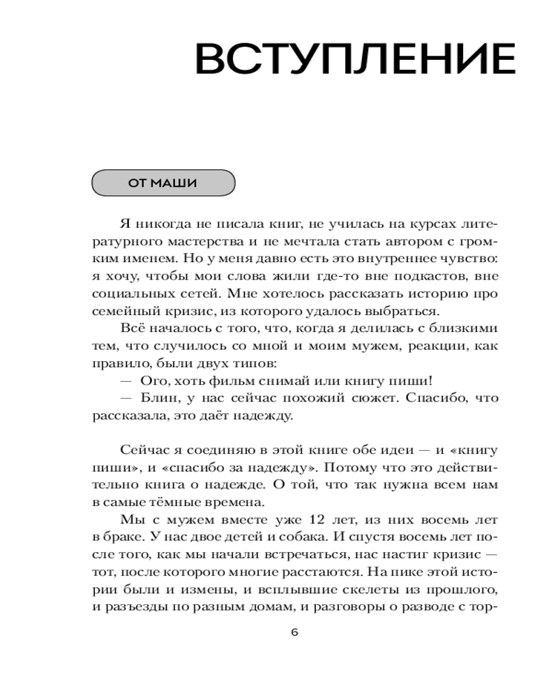 💳 Оплатить за товар можно при получении 🇰🇿 Есть бесплатная доставка по Казахстану 🎁 Копите бонусы с каждой покупки Серия: Хранители любви. Книги, которые помогут сберечь отношения Книга для тех, кто хоть раз задавался вопросом: «А стоит ли оставаться в этих отношениях?» В 2022 году именно так чувствовали себя Маша и Лёня на грани развода, но вместо точки они выбрали запятую — и начали говорить честно. Так появился подкаст «Чуть не развелись». Маша и Лёня перешли от откровенных разговоров на кухне к открытому диалогу в интернете, а теперь их слушают более 10 тысяч подписчиков по всему миру. В книге они расскажут свою историю сохранения любви дважды — от лица женщины и от лица мужчины. |