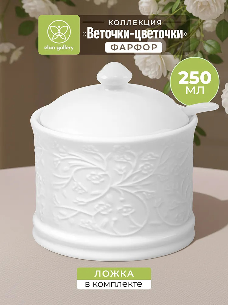 Сахарница из серии «Веточки-цветочки» от Elan Gallery предназначена для эстетичной сервировки вашего стола. Размер ёмкости — 9×9×10 см, объём — 250 мл. Выполнена из высококачественного белого фарфора. Он не впитывает цвет продуктов и легко отмывается, благодаря чему надолго сохранит свою белизну. Поверхность изделия украшают рельефные узоры в виде лиственных веточек с аккуратными цветочными бутончиками. Поставляется в комплекте с фарфоровой ложкой размером 11×2.5 см.