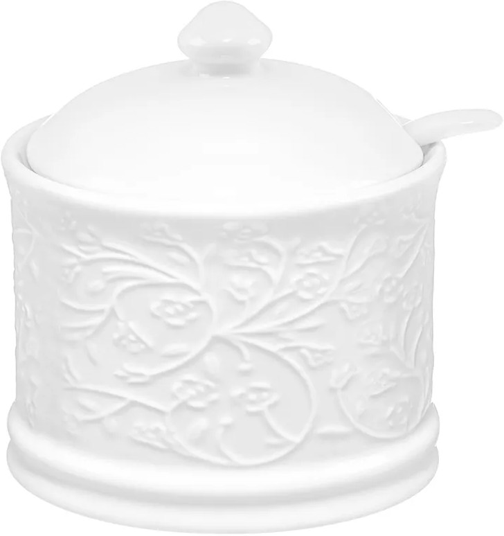 Декоративная баночка добавит особого шарма вашему кухонному инвентарю. Она подойдёт для хранения не только сахара, но и соли, специй и приправ. Засыпьте внутрь чай или кофе, чтобы в любой момент заварить свежий напиток. Подайте её вместе с горячими блюдами, чтобы каждый мог приправить пищу по своему вкусу. Стильное изделие также можно приспособить под варенье, мёд или икру. Маленькая ложечка позволит набрать необходимое количество продуктов. Она компактно помещается в баночке благодаря выемке на крышке. Такое изделие отлично дополнит сервировку стола как для сытного завтрака, так и для уютного чаепития.