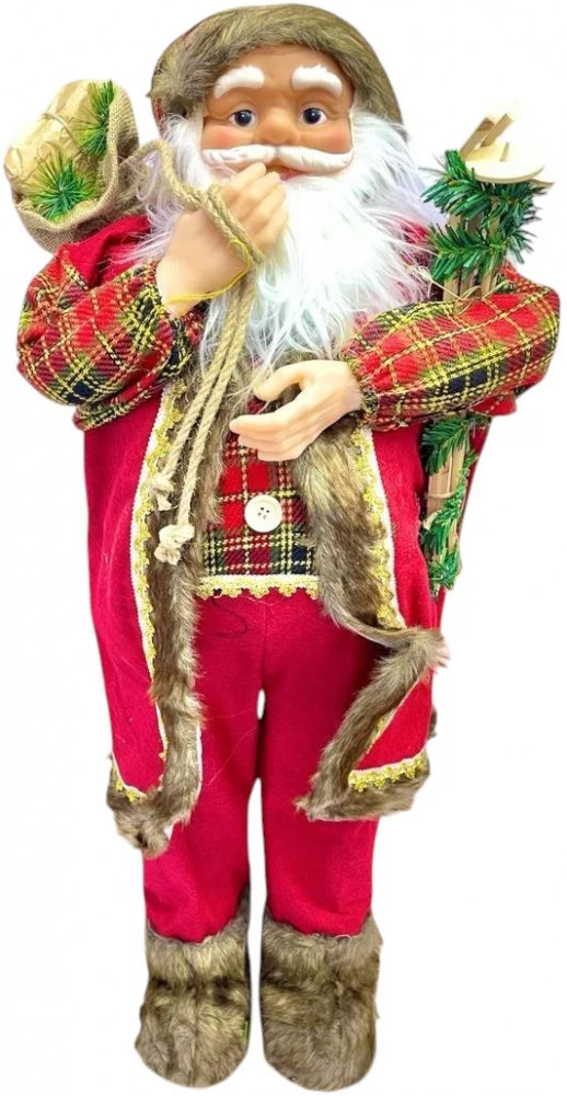 Фигурка Деда Мороза в красном костюме с клетчатым жакетом и меховой отделкой выглядит особенно нарядно и ярко. За плечом он несёт мешок, украшенный еловыми ветками и лентами, а в руках держит праздничный декор, готовый к украшению дома. Детализированное лицо, аккуратная борода и продуманная отделка костюма делают этого Деда Мороза выразительным акцентом в новогоднем интерьере или витринном оформлении.