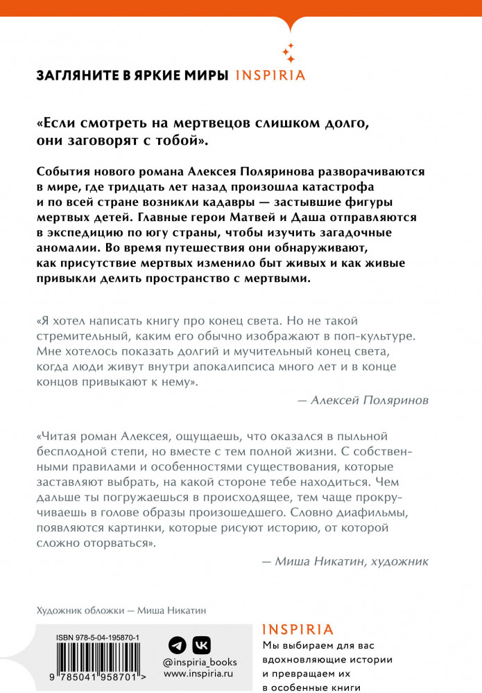 События нового романа Алексея Поляринова разворачиваются в мире, где тридцать лет назад произошла катастрофа и по всей стране возникли кадавры — застывшие фигуры мертвых детей. Главные герои, Матвей и Даша, отправляются в экспедицию по югу страны, чтобы изучить загадочные аномалии. Во время путешествия они обнаруживают, как присутствие мертвых изменило быт живых и как живые привыкли делить пространство с мертвыми.