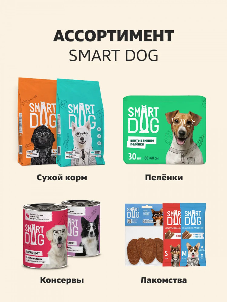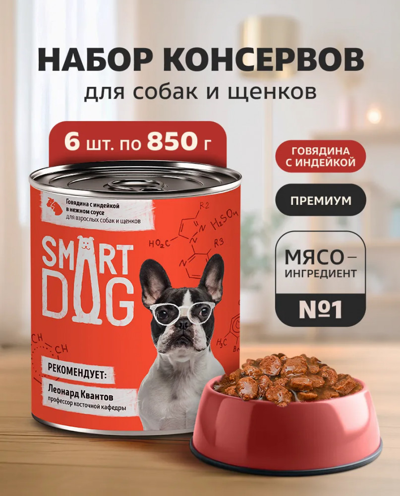 Smart Dog Набор консервов для взрослых собак и щенков «Кусочки говядины с потрошками в нежном соусе»