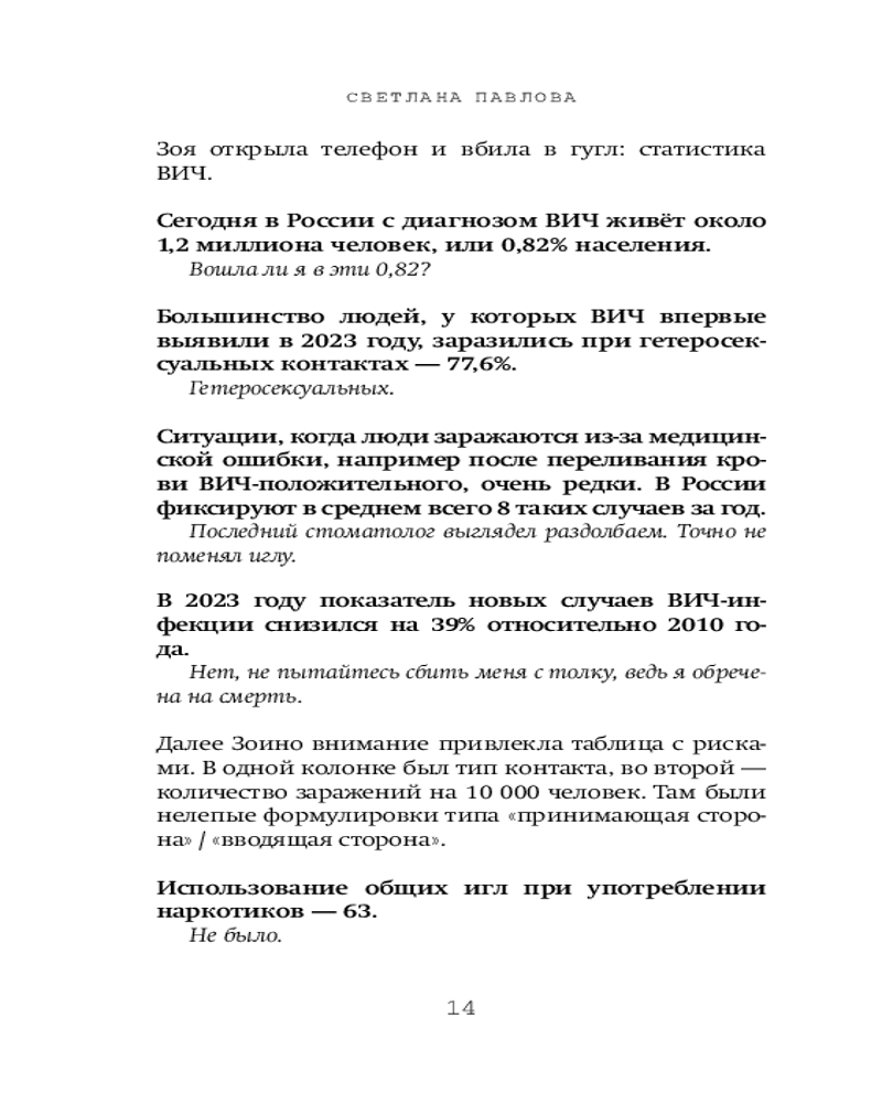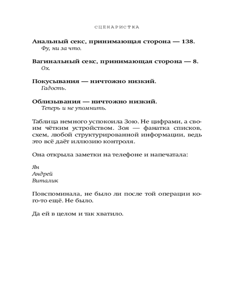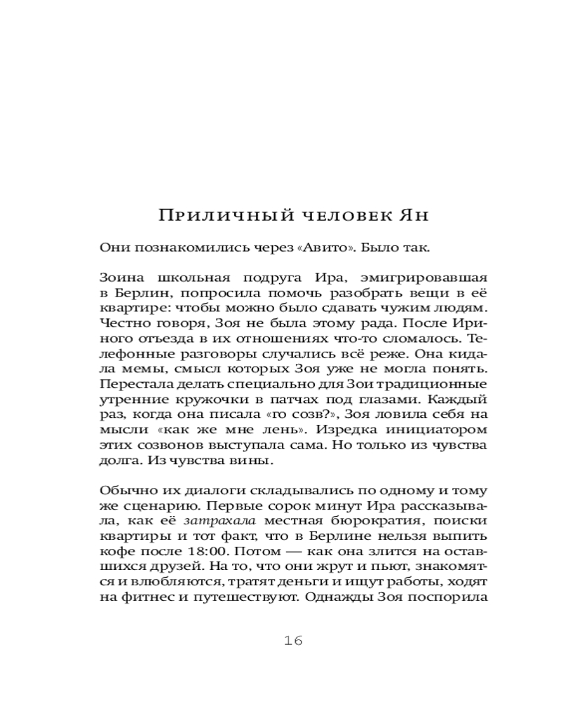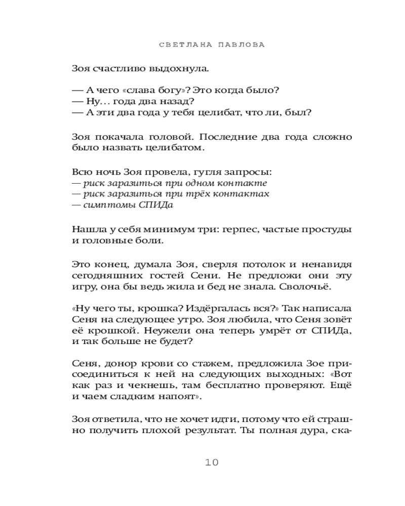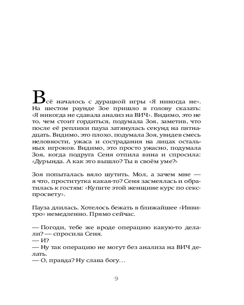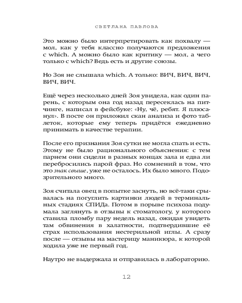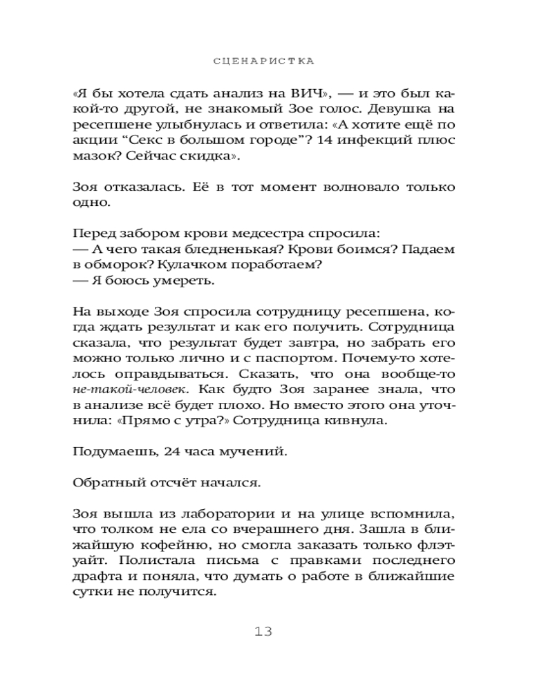 💳 Оплатить за товар можно при получении 🇰🇿 Есть бесплатная доставка по Казахстану 🎁 Копите бонусы с каждой покупки Серия: Роман поколения Начинающая сценаристка Зоя никогда не сдавала тест на ВИЧ. В ожидании анализа она составляет список — Ян, Андрей, Виталик — и вспоминает романтические эпизоды последних лет. Эта книга о том, как нынешние 30-летние ищут отношения, о том, что эти отношения подчас — не панацея от проблем, ещё — о жизни в плену магического мышления, о стигматизации ВИЧ и дремучести убеждений, с ним связанных, о поиске своего дела и радости настоящей дружбы. |