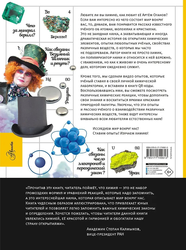 💳 Оплатить за товар можно при получении 🇰🇿 Есть бесплатная доставка по Казахстану 🎁 Копите бонусы с каждой покупки Серия: Первая энциклопедия с видеоуроками Книга известного учёного Артёма Оганова расскажет школьникам о химических элементах, атомах и молекулах, кристаллах, а яркие запоминающиеся иллюстрации художника Василисы Зинковой дополнят интересный рассказ, заставив подростков улыбнуться. В книгу добавлены QR-коды, с помощью которых можно посмотреть видео химических опытов, поставленных в лаборатории автором. Для среднего и старшего школьного возраста. |