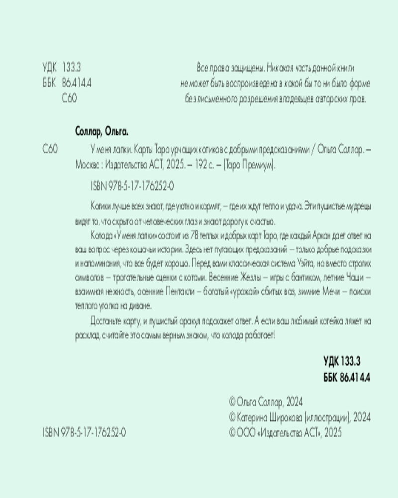 💳 Оплатить за товар можно при получении 🇰🇿 Есть бесплатная доставка по Казахстану 🎁 Копите бонусы с каждой покупки Серия: Таро премиум Колода включает в себя 78 уютных карт, где каждый Аркан говорит с вами на языке кошек. Никаких пугающих пророчеств — только деликатные подсказки и ответы на вопросы, которые в виде карт протягивают вам пушистые лапки. Колода сочетает в себе символику Уэйта и истории из жизни котиков. Классические Арканы раскрывают свои значения с новой стороны и заставляют не только умилиться от увиденного на карте, но и задуматься. Почему в состоянии Повешенного нельзя паниковать? Когда энергия Силы становится чрезмерной? Как мы сами разбиваем свое сердце в Тройке Мечей? |