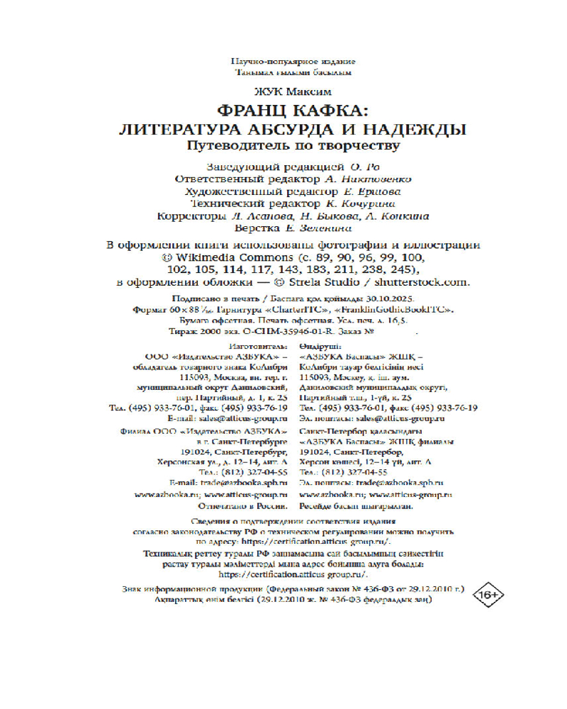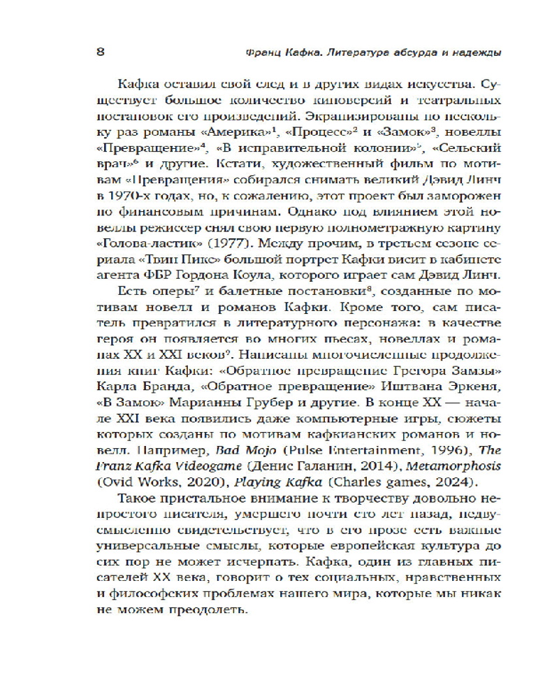 💳 Оплатить за товар можно при получении 🇰🇿 Есть бесплатная доставка по Казахстану 🎁 Копите бонусы с каждой покупки Серия: Человек Мыслящий. Идеи, способные изменить мир Книга посвящена творчеству Франца Кафки в контексте культуры и литературы ХХ века. В ней показаны исторический и культурный контексты, сформировавшие писателя, очерчены контуры его художественного мира, представлены различные варианты интерпретаций ключевых произведений Кафки: новеллы «Превращение» и романов «Америка», «Процесс», «Замок». Отдельная часть посвящена восприятию наследия писателя в русской культуре и судьбе публикации его произведений в СССР. Впервые на русском языке опубликована новелла Карла Бранда «Обратное превращение Грегора Замзы» (1916) — продолжение кафкианской новеллы «Превращение» (1912). |