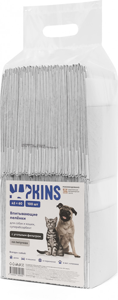 Одноразовые впитывающие пелёнки Napkins с угольным фильтром и креплениями для удобной фиксации обеспечивают моментальное впитывание и надежно удерживают влагу. Идеально подходят для использования дома, в ветеринарной клинике или в поездках. Мягкий безопасный материал обеспечивает комфорт для питомца, а суперабсорбент в составе обеспечивает безупречную сухость надолго.