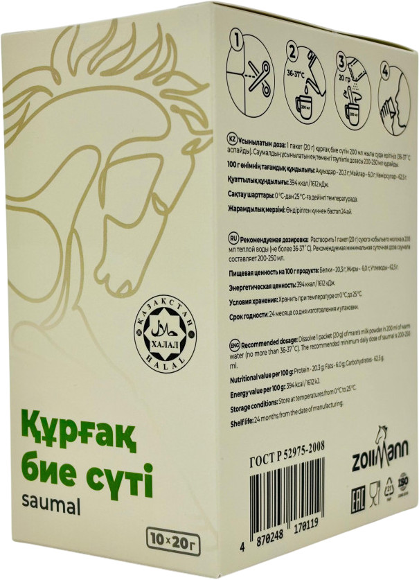 💳 Оплатить за товар можно при получении 🇰🇿 Есть бесплатная доставка по Казахстану 🎁 Копите бонусы с каждой покупки Саумал — 100% натуральное кобылье молоко, сухое сублимированное изготовленное по немецкой технологии. Богат витаминами группы В1,В2,В3,В5,В6,В9 (фолиевая кислота), В12,Д, Е, С, Бета-каротин. Содержит минералы: Na, K, Mg, Ca, P, Zn, Fe, I, Se и ПНЖК: Омега 3 и 6, которые поддерживают здоровье сердца, мозга, печени, сосудов и нервной системы. Упакован в персональные саше для удобства приготовления. Продукция имеет сертификаты качества. Без ГМО и консервантов. Производство — Казахстан, Костанайская область. Собственная ферма более 1000 голов лошадей кушумской породы. |