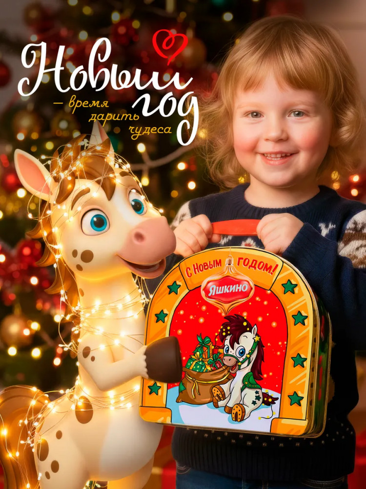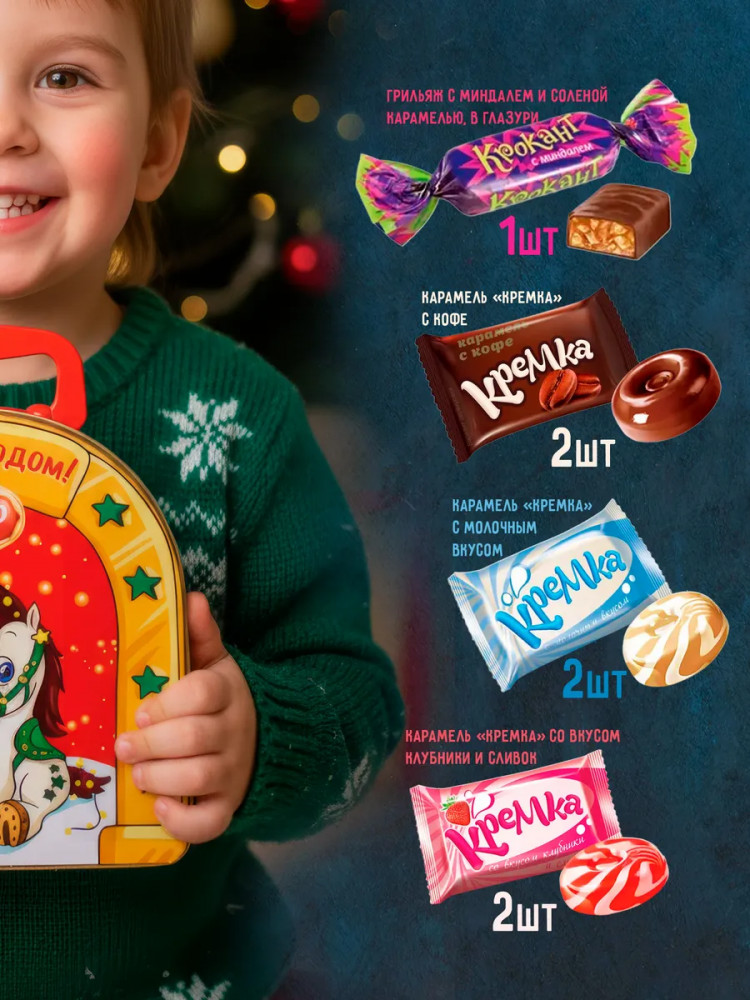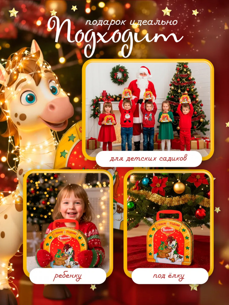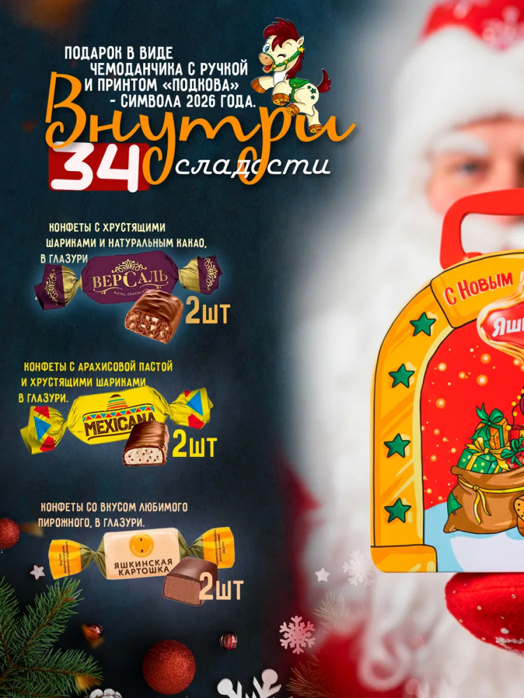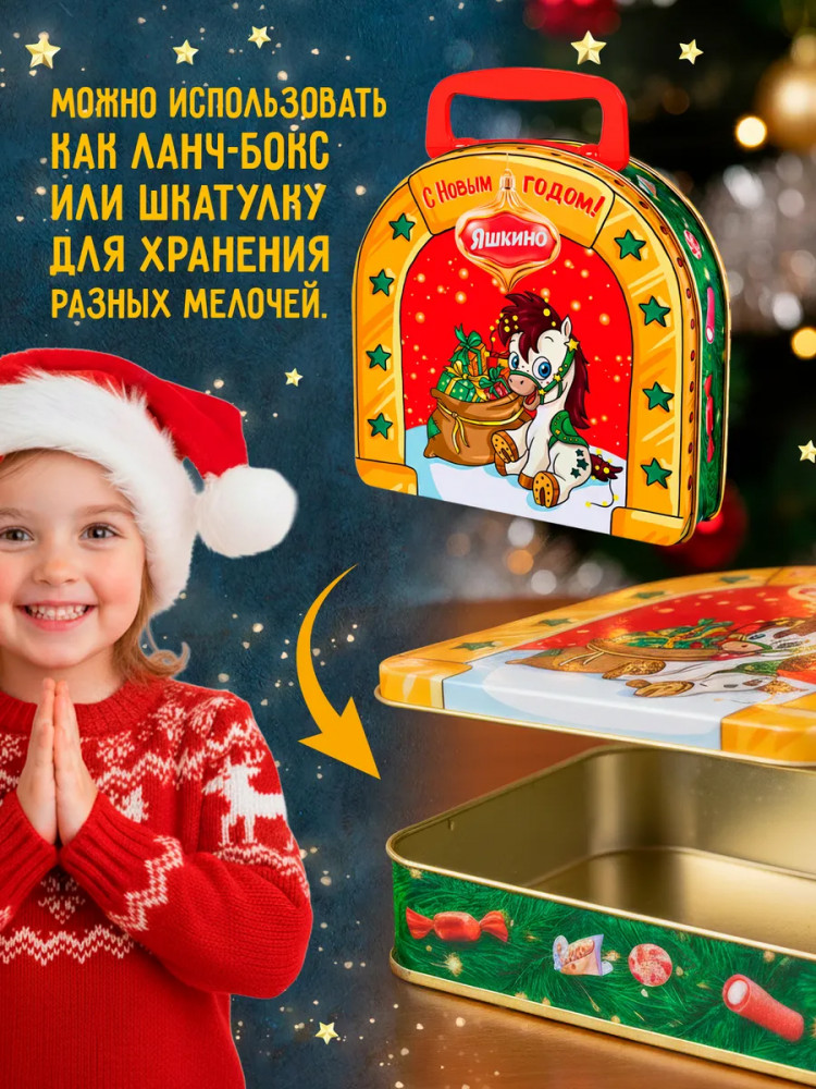 Подарок в виде чемоданчика с ручкой и принтом «Подкова» — символа 2026 года. Внутри него — глазированные и неглазированные конфеты, карамель и жевательный мармелад. Красочную жестяную коробку, в которую упакованы сладости, можно использовать как ланч-бокс или шкатулку для хранения разных мелочей.