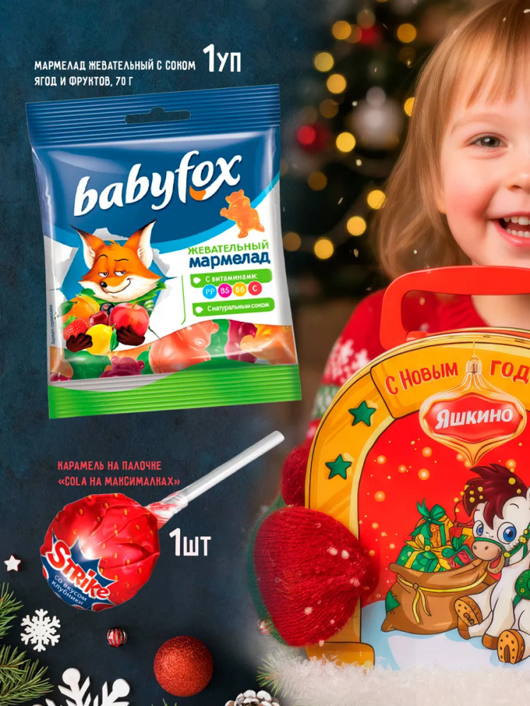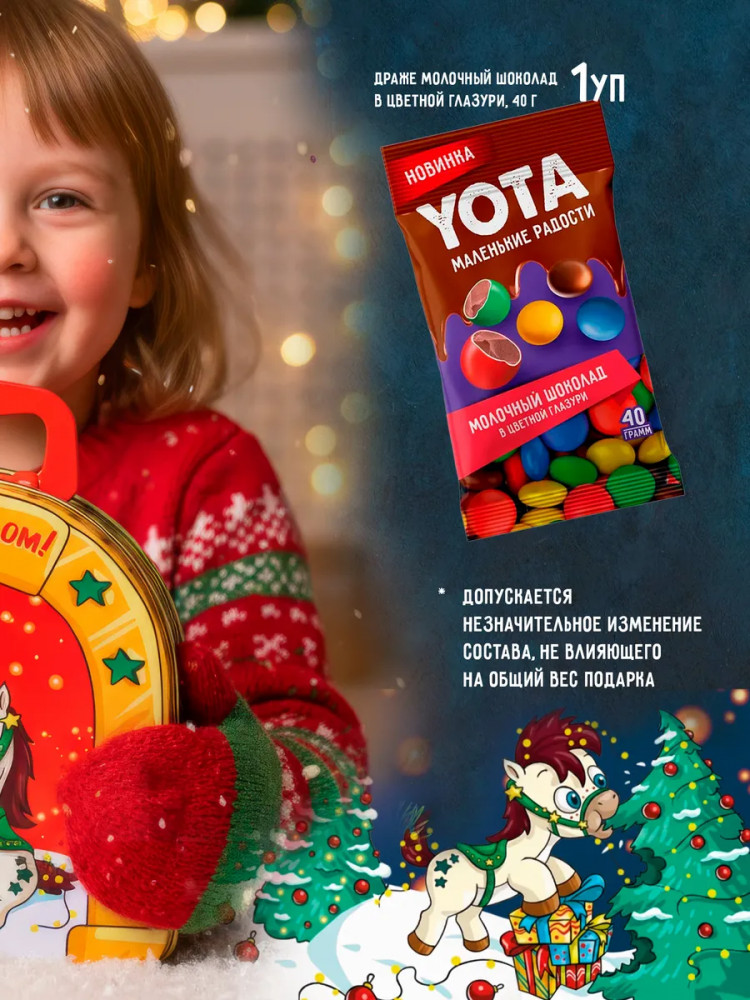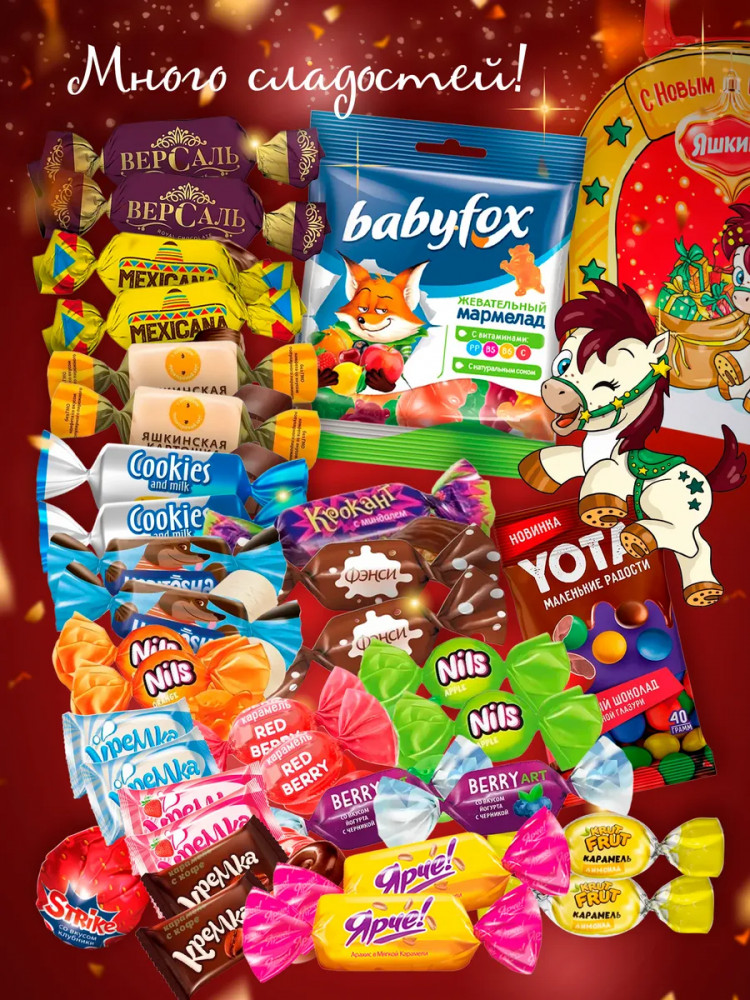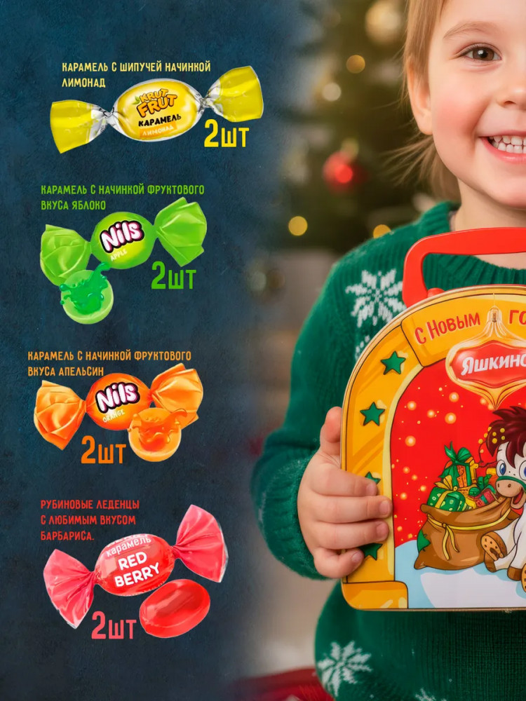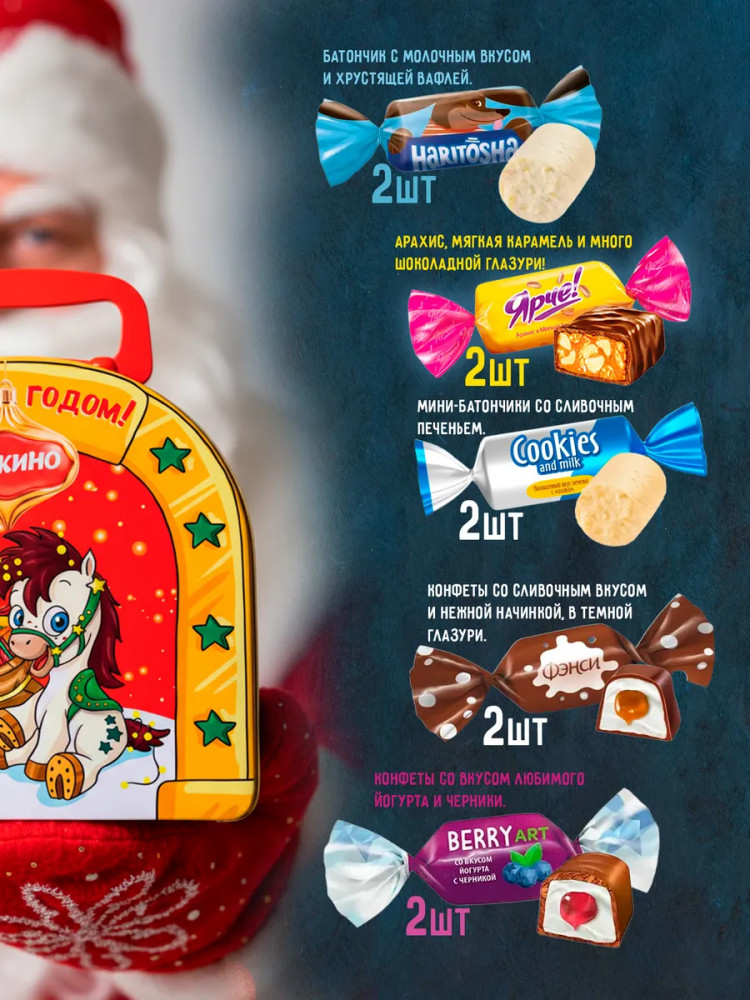 Подарок в виде чемоданчика с ручкой и принтом «Подкова» — символа 2026 года. Внутри него — глазированные и неглазированные конфеты, карамель и жевательный мармелад. Красочную жестяную коробку, в которую упакованы сладости, можно использовать как ланч-бокс или шкатулку для хранения разных мелочей.