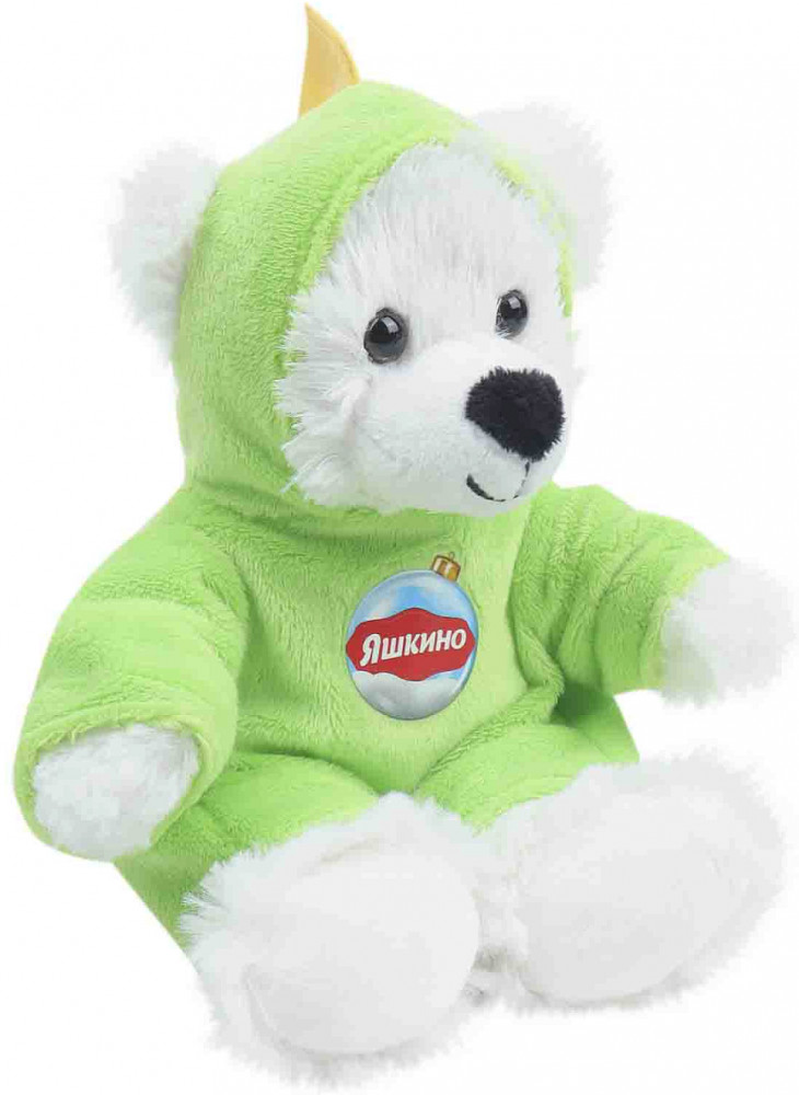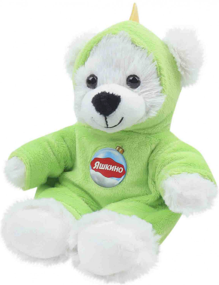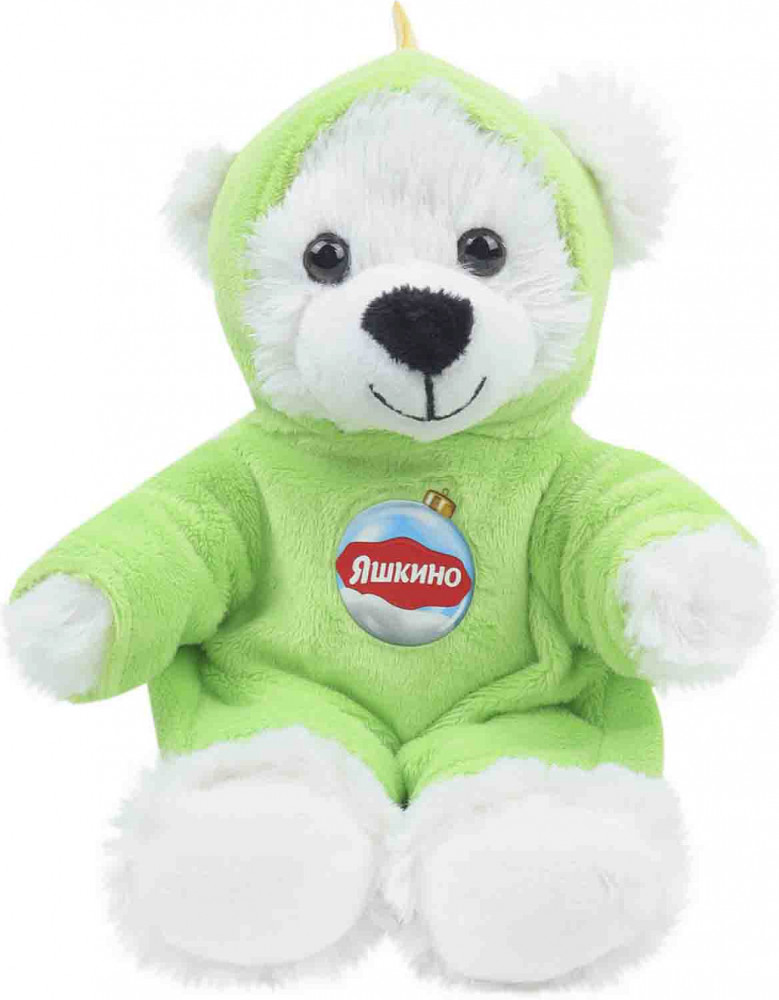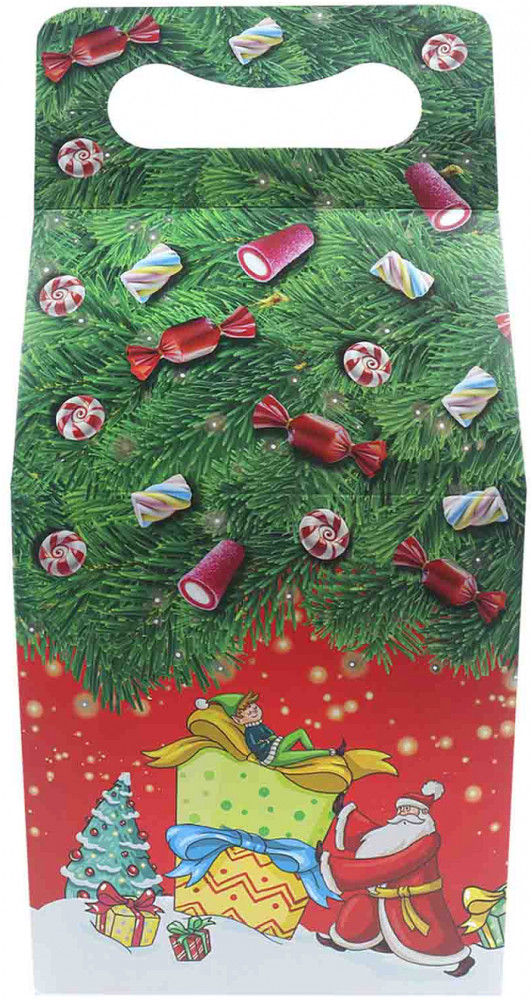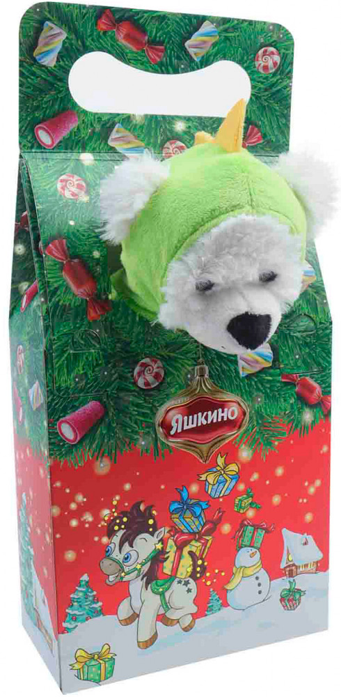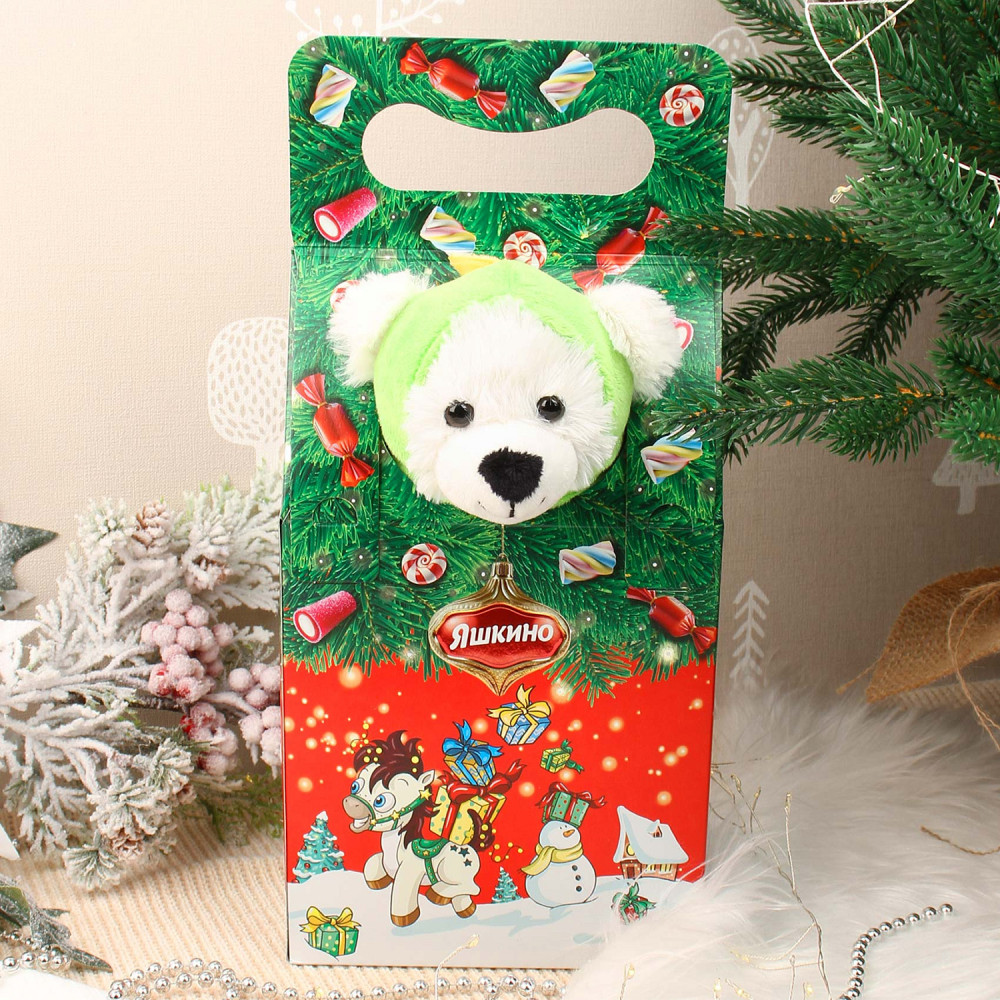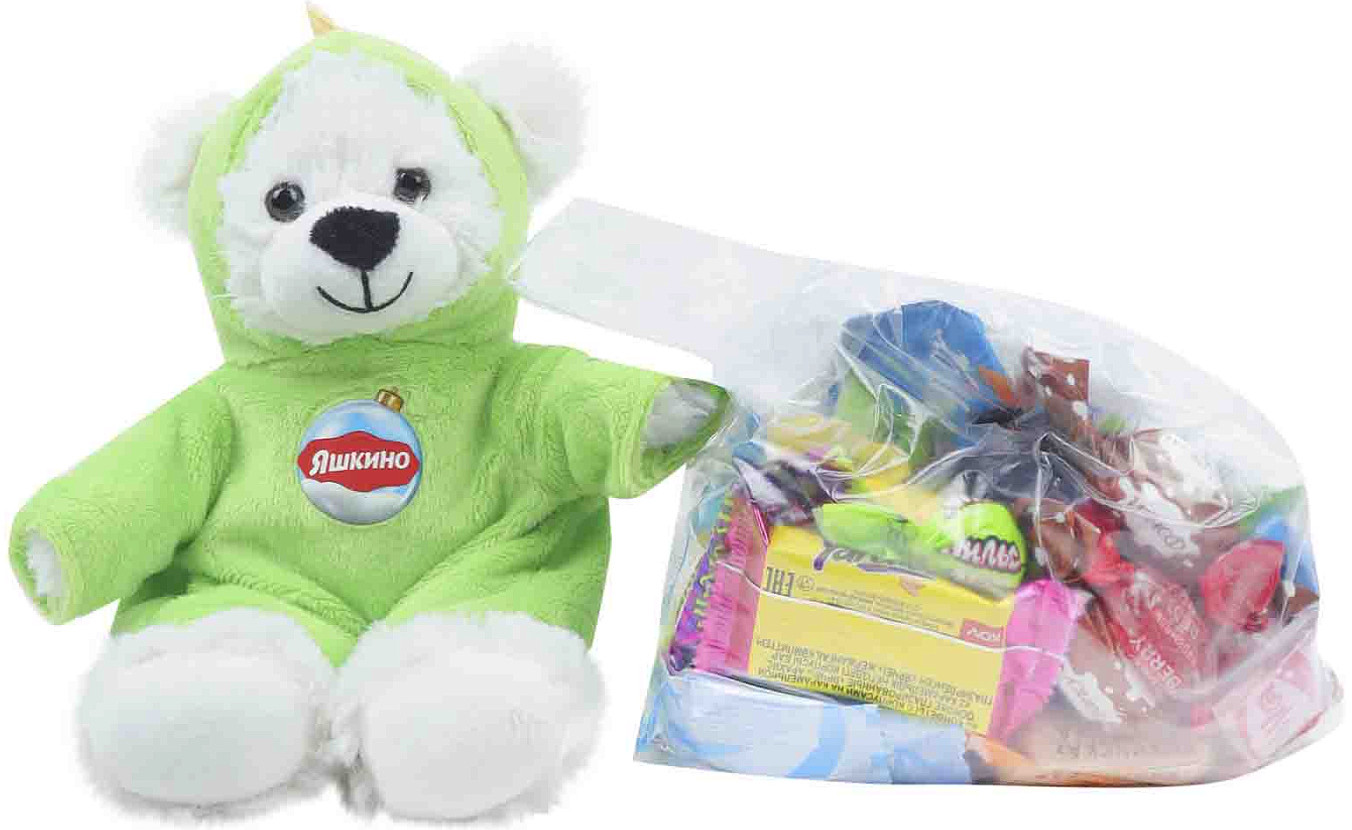 Подарок из глазированных и неглазированных конфет, карамели, жевательного мармелада. Сладости в нарядной картонной сумочке с новогодним дизайном, в которую вложена мягкая игрушка — 15-сантиметровый медвежонок в комбинезоне.