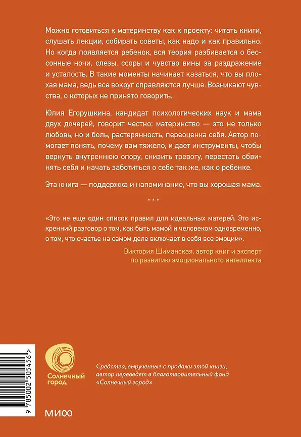 Серия: Авторская серия Юлии Егорушкиной Материнство переворачивает внешний и внутренний мир. Быть мамой — значит стараться изо всех сил, даже когда не осталось сил. За улыбками и заботой часто прячутся тревога, усталость и вина. Именно о такой — настоящей — стороне материнства эта книга.