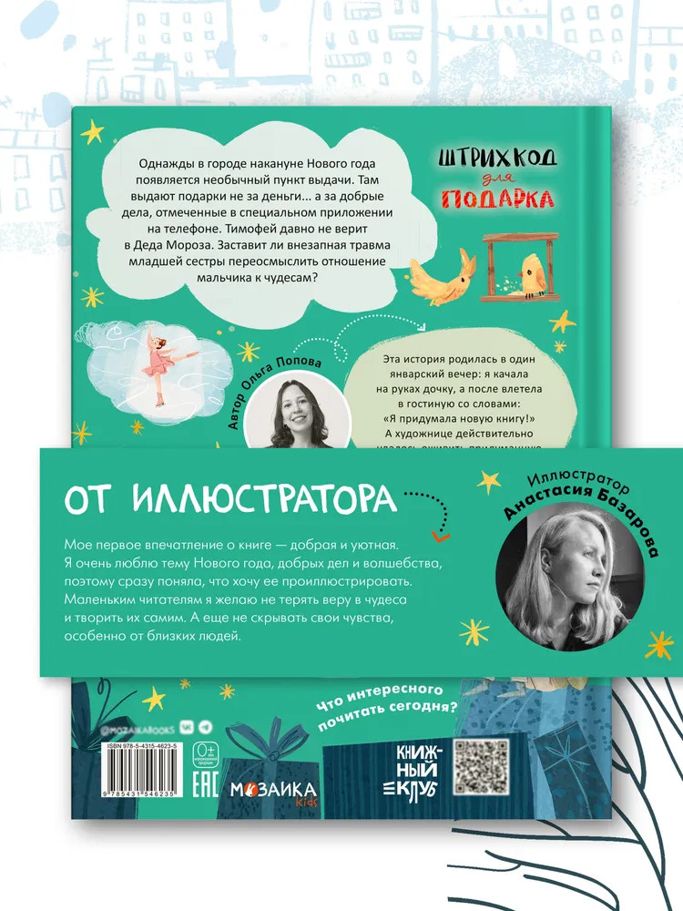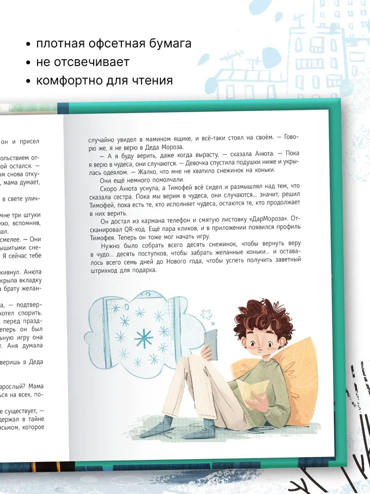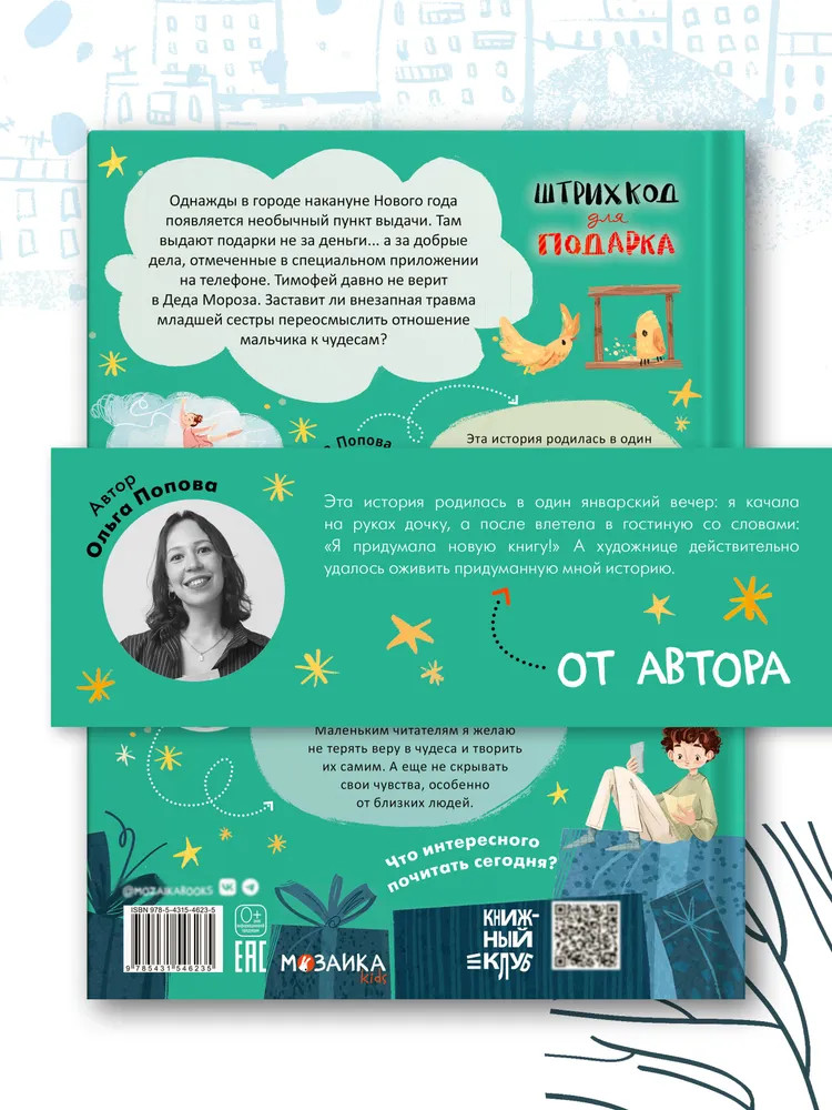 💳 Оплатить за товар можно при получении 🇰🇿 Есть бесплатная доставка по Казахстану 🎁 Копите бонусы с каждой покупки Серия: Книжный клуб. Сам почитаю! Однажды в городе накануне Нового года появляется необычный пункт выдачи. Там выдают подарки не за деньги... а за добрые дела, отмеченные в специальном приложении на телефоне. Тимофей давно не верит в Деда Мороза. Заставит ли внезапная травма младшей сестры переосмыслить отношение мальчика к чудесам? |